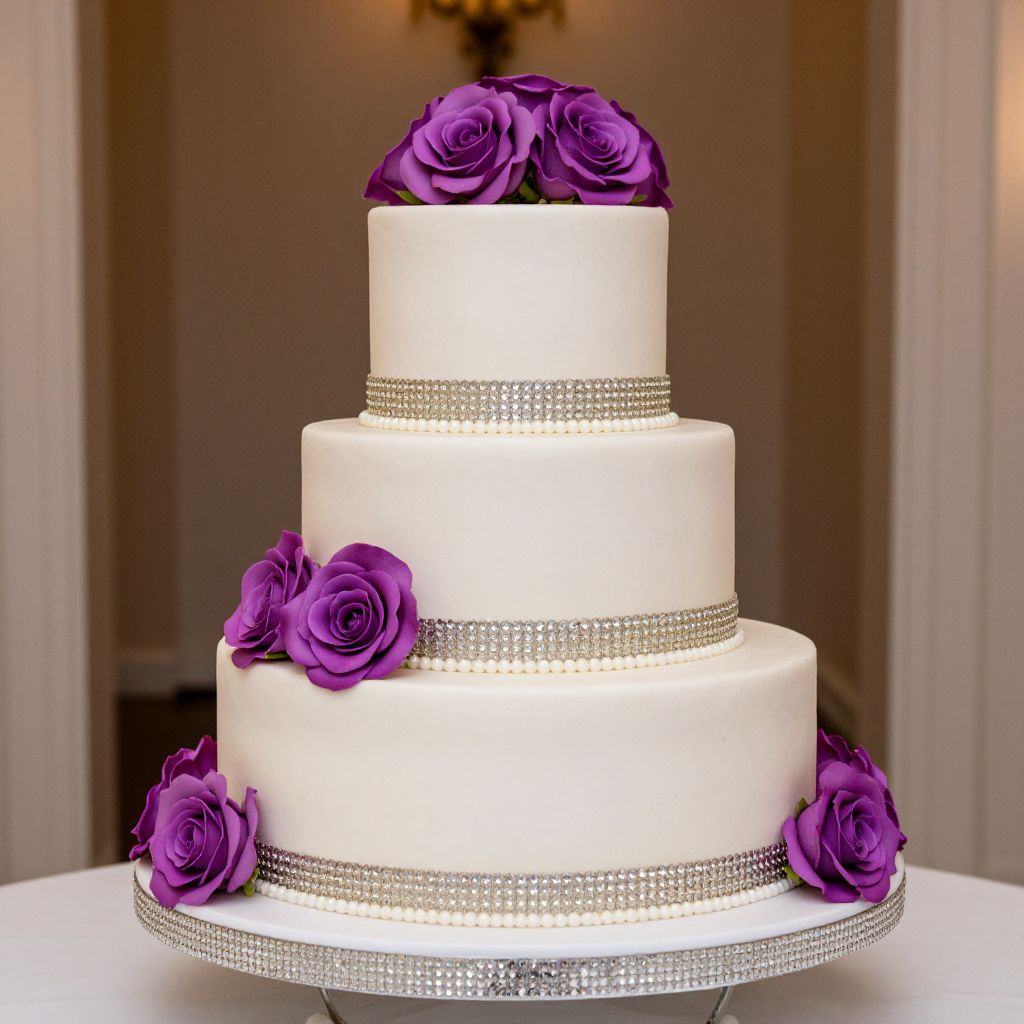 Photograph of a three-tier white wedding cake adorned with purple roses, silver beaded ribbons, and a sparkling base.