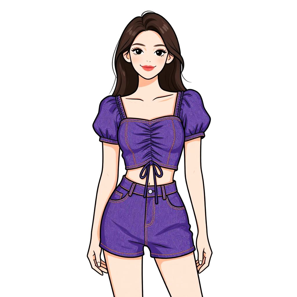 Illustration of a woman with a pretty face and simple hairstyle wearing a white mini dress featuring multicolored floral embroidery, square neckline, short puff sleeves, and a smocked bodice. She pairs the dress with black combat boots with yellow stitching. The background depicts an indoor retail environment with clothing racks and soft lighting.