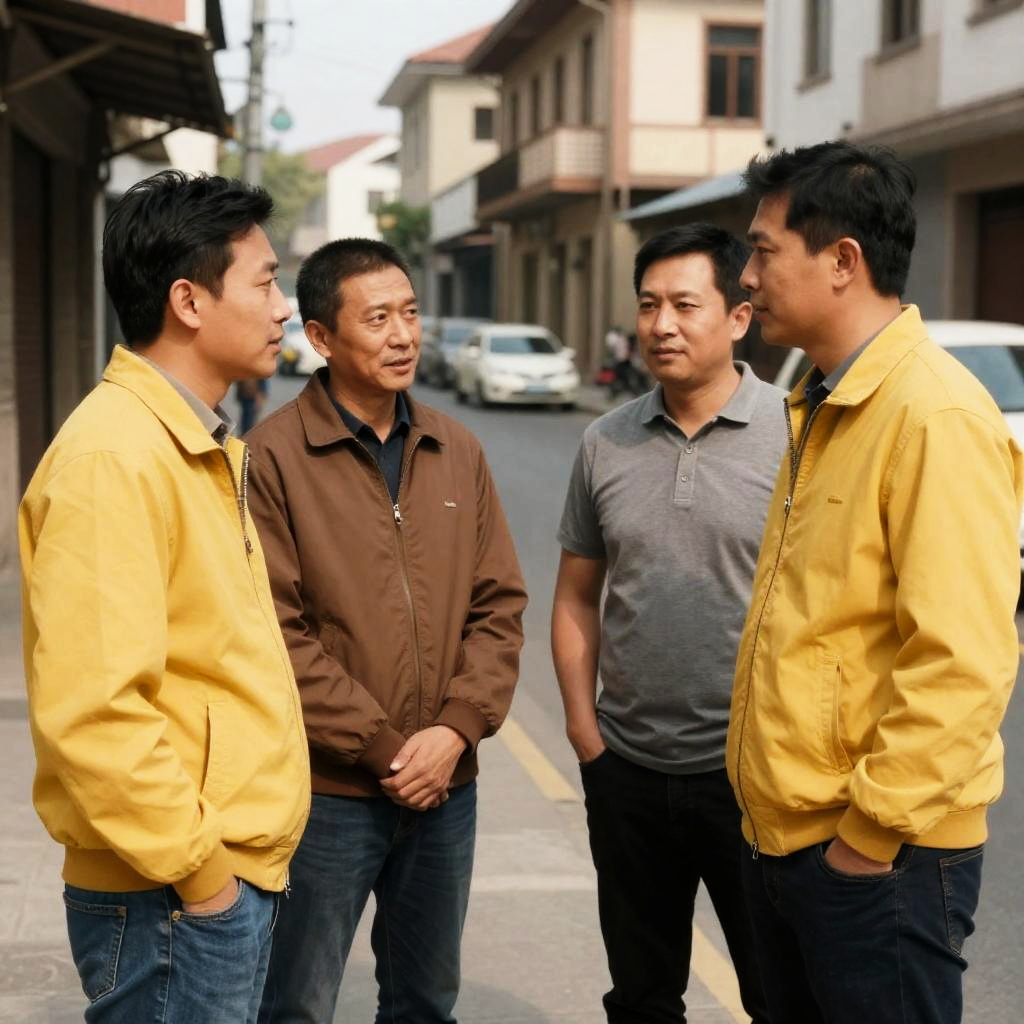 Group of seven men pushing a metal shopping cart, surrounded by smoke. Five men wearing sunglasses, one elderly man in blue, one man in yellow sweater. Concrete road, wooden pallets, buildings in background. Smoky atmosphere, urgent movement.