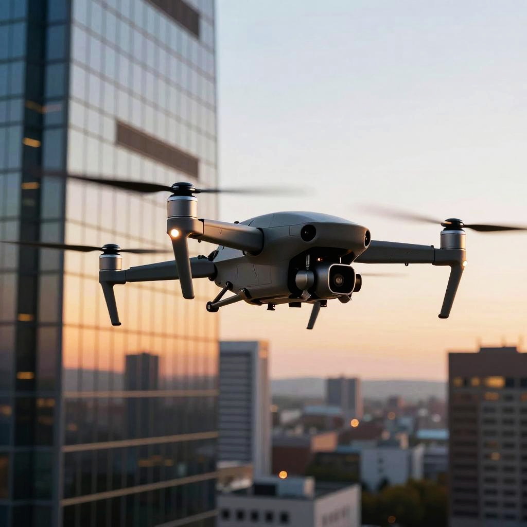 Photograph of a silver drone flying in front of modern glass skyscrapers at sunset, with a cityscape in the blurred background.