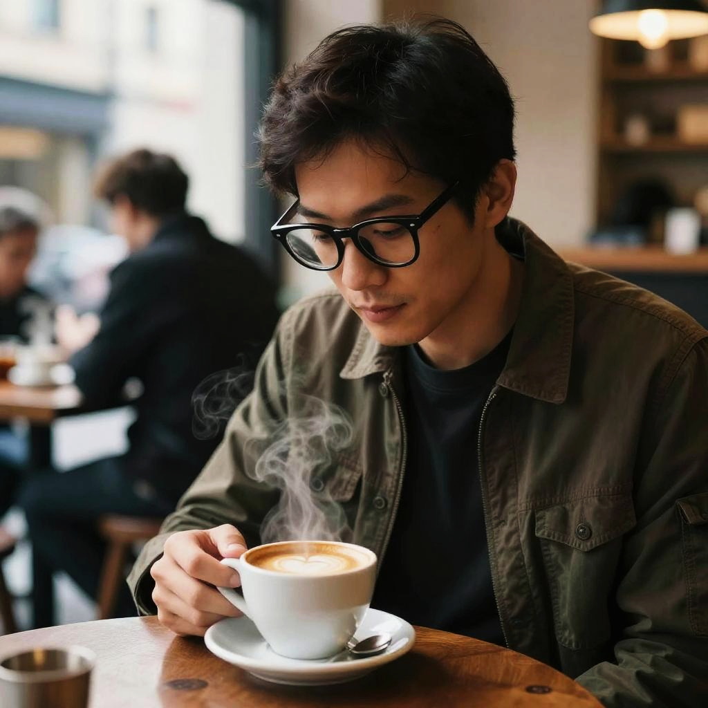 Character with black glasses in a bustling coffee shop, casual attire, steam rising from a cup of coffee, capturing a candid urban moment with rich textures and natural light.