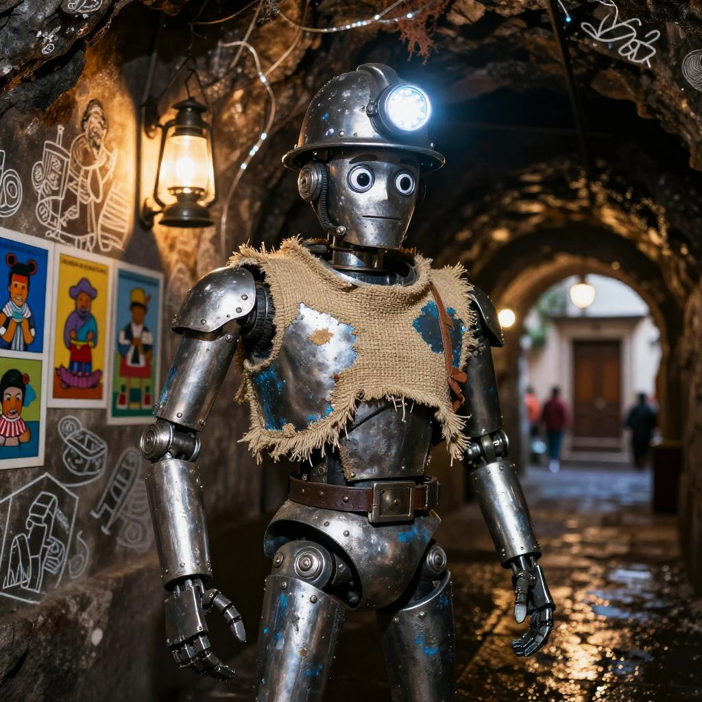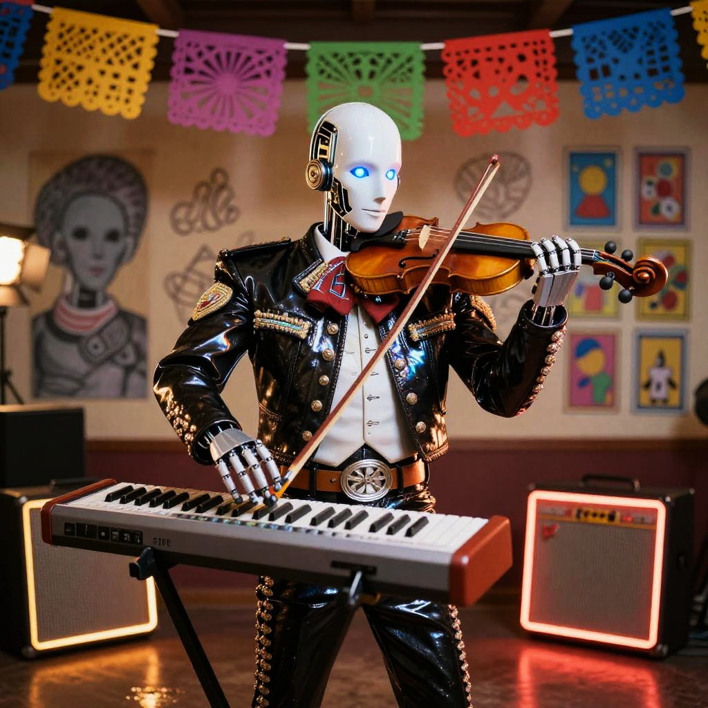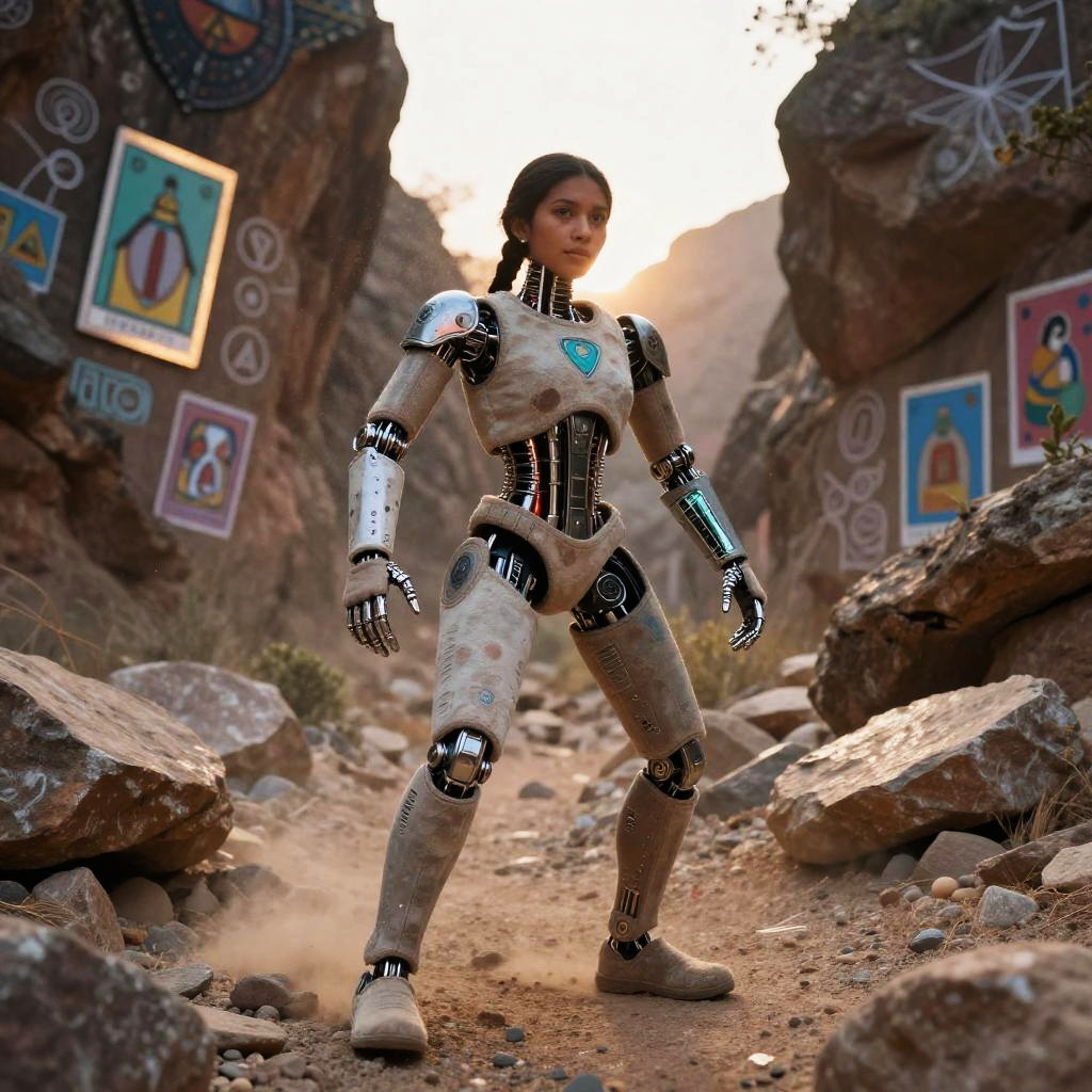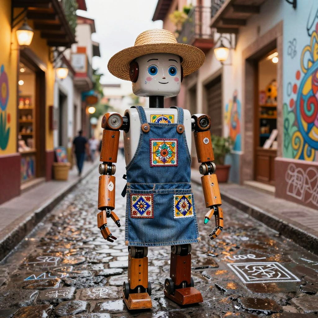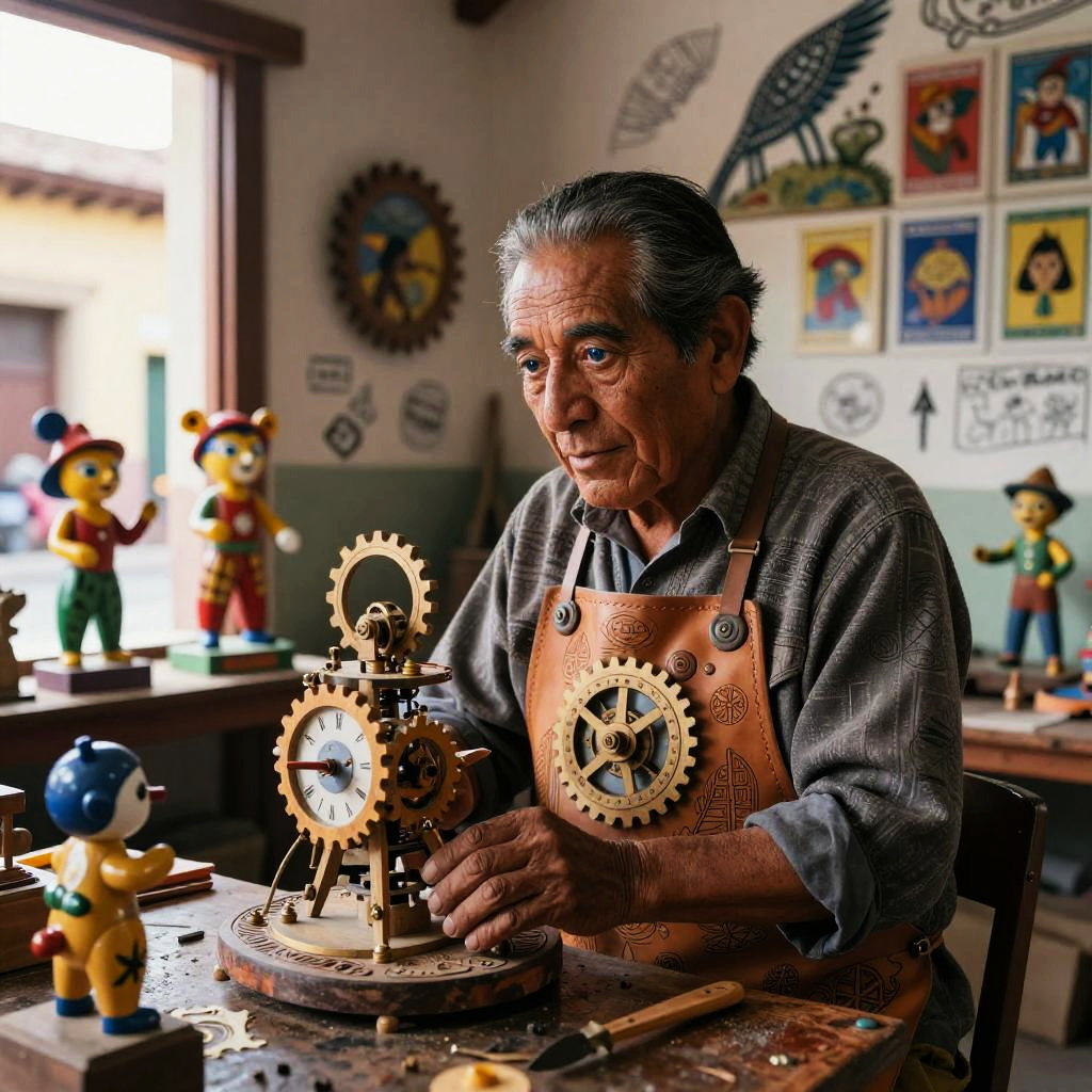 Traditional Mexican toy maker rebuilt as a multifaceted crafting automaton wearing wood-carved apron embedded with tiny robotic tools and painted vibrant folk patterns, set in bright craft workshop overflowing with hand-painted brinquedos and spinning gears, expressive luminous eyes, witty posture, cultural warmth; nostalgic humor fused with advanced AI; layered murals, chalk doodles, lotería motifs; warm rim light, cinematic depth of field, realistic metal wear, subtle film grain, wet street reflections; vibrant yet tender palette, storytelling composition, high detail, photoreal surfaces with hand-painted imperfections