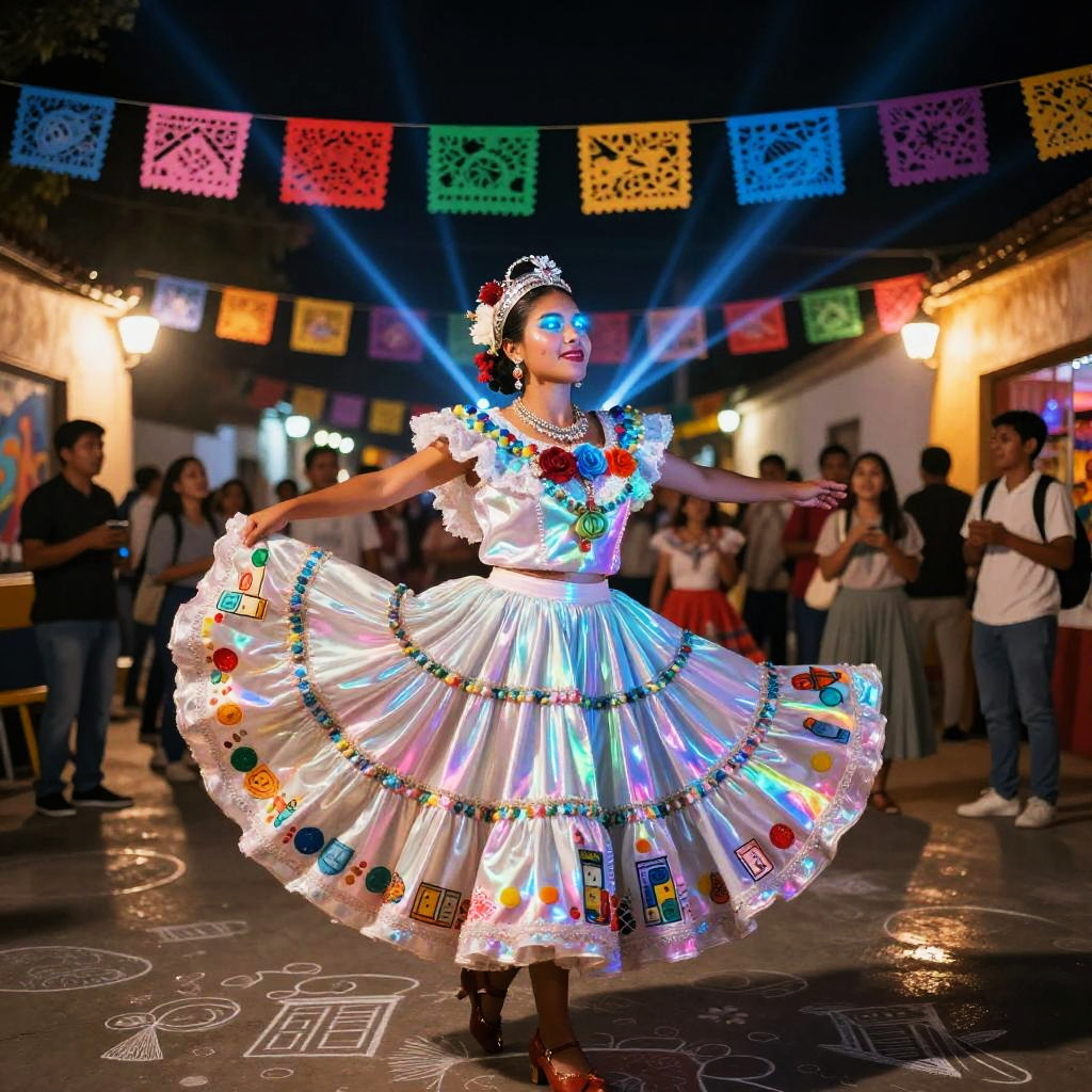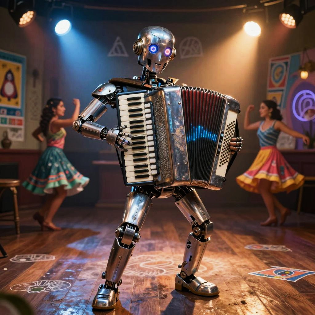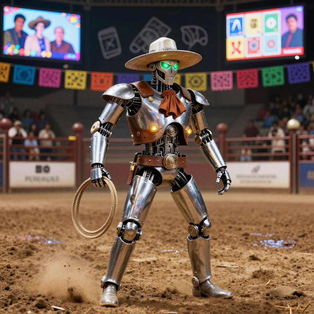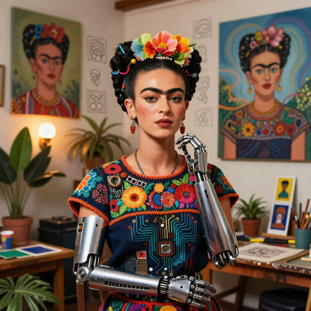Traditional Mexican toy maker rebuilt as a multifaceted crafting automaton wearing wood-carved apron embedded with tiny robotic tools and painted vibrant folk patterns, set in bright craft workshop overflowing with hand-painted brinquedos and spinning gears, expressive luminous eyes, witty posture, cultural warmth; nostalgic humor fused with advanced AI; layered murals, chalk doodles, lotería motifs; warm rim light, cinematic depth of field, realistic metal wear, subtle film grain, wet street reflections; vibrant yet tender palette, storytelling composition, high detail, photoreal surfaces with hand-painted imperfections
