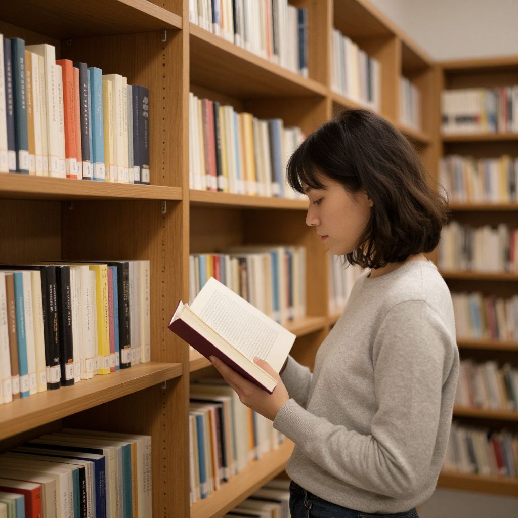 Woman engrossed in reading a book amidst rows of wooden shelves filled with colorful volumes in a warmly lit library.