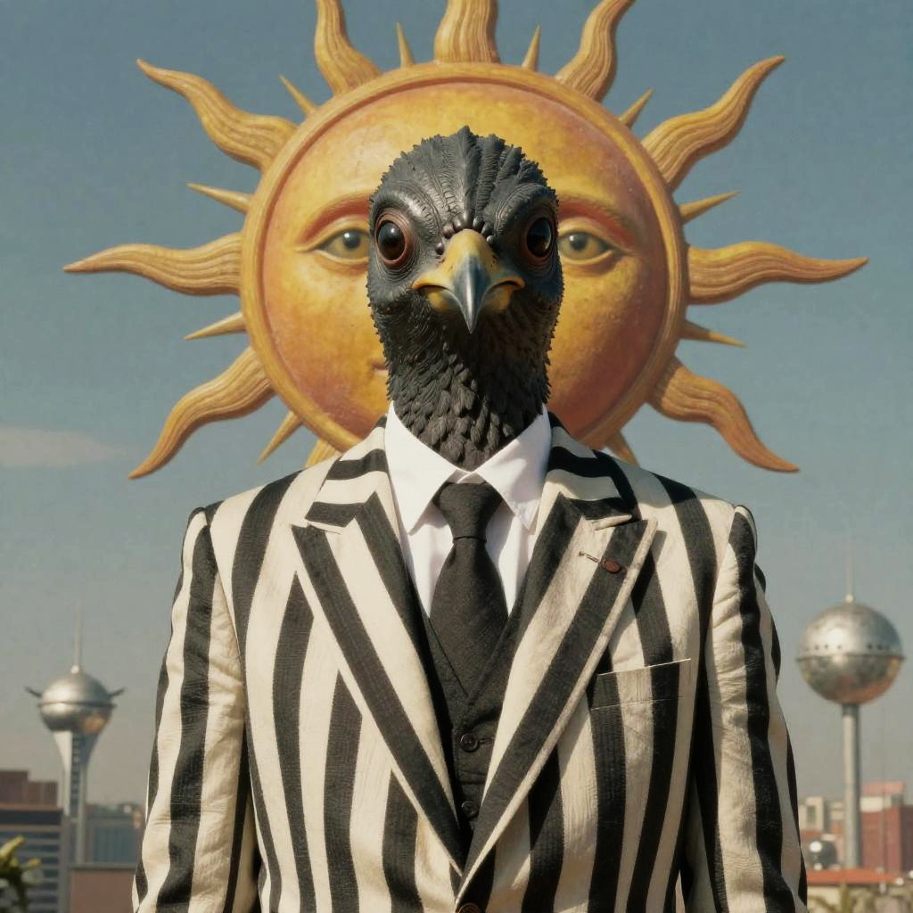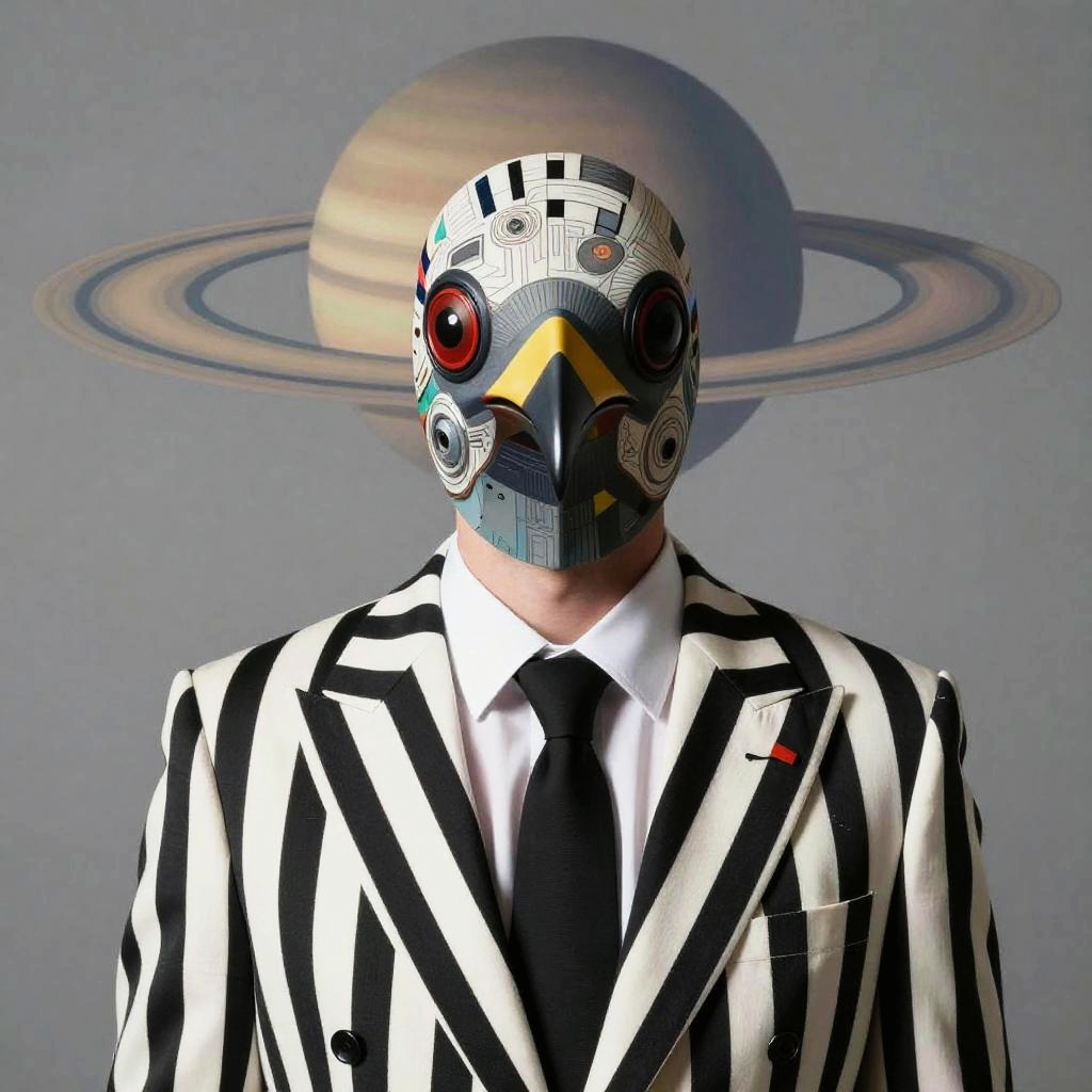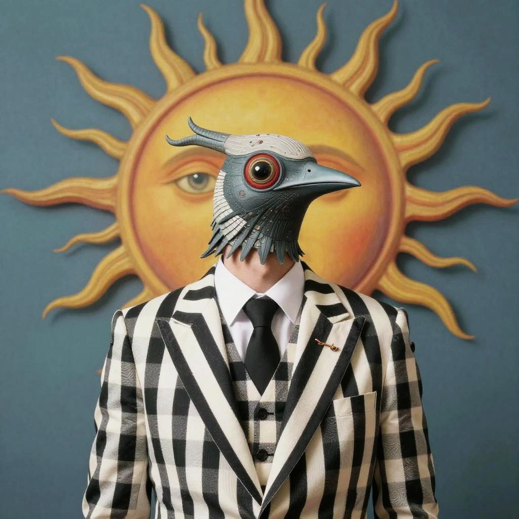 A man with a bird-like face, set against a conceptual background representing Sun in Capricorn. Dressed in a black and white striped and checkered suit, the style combines influences of Zdzisław Beksiński, Dystopian Surrealism. Rendered as a hyperrealistic photo, the composition captures a surreal, Farinetti-inspired artwork concept, with intricate, futuristic details and a thought-provoking aesthetic.