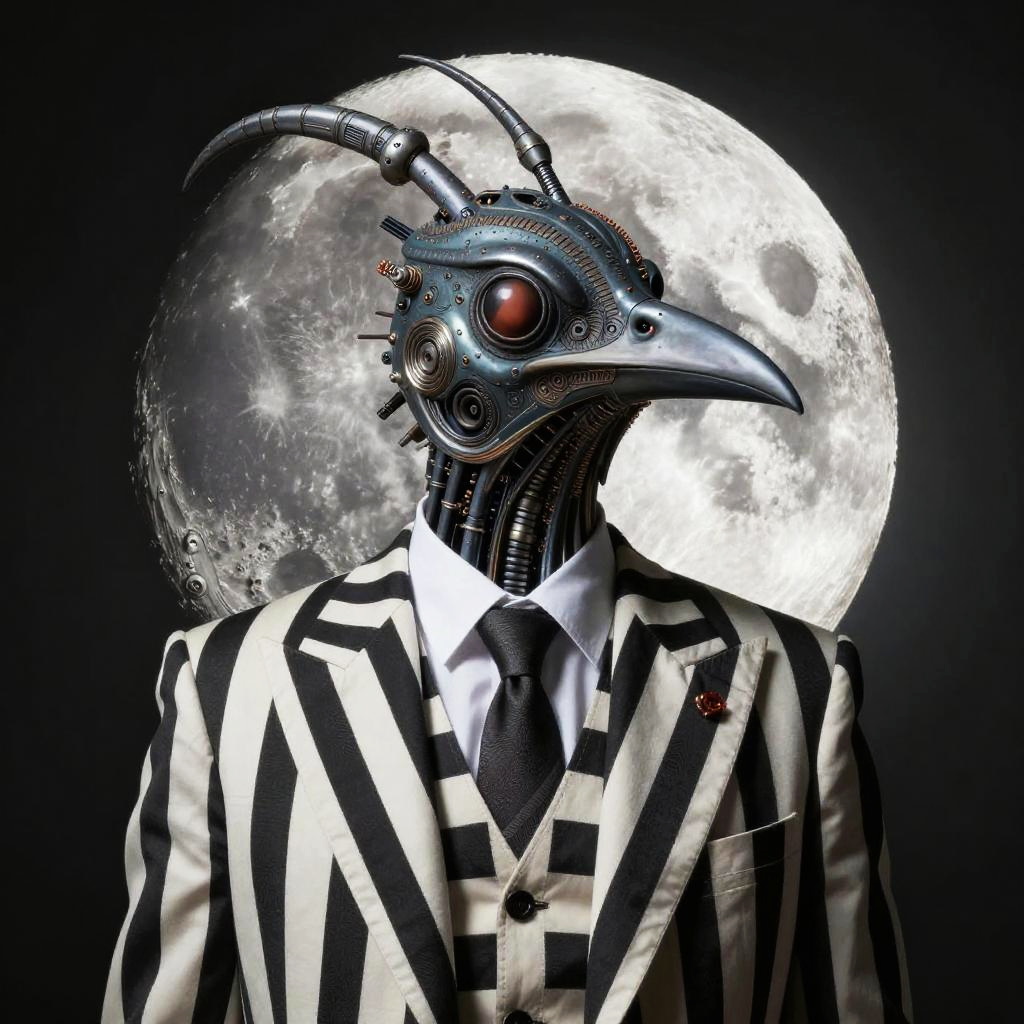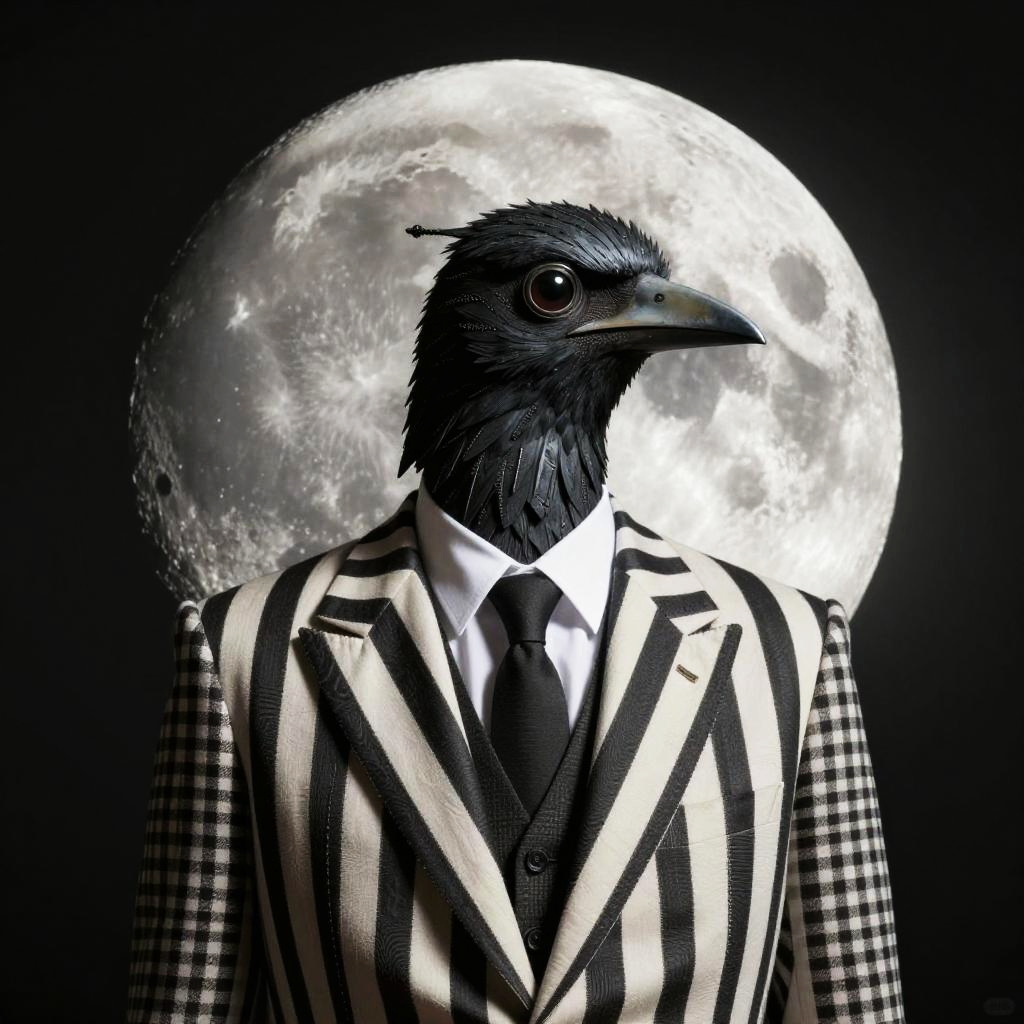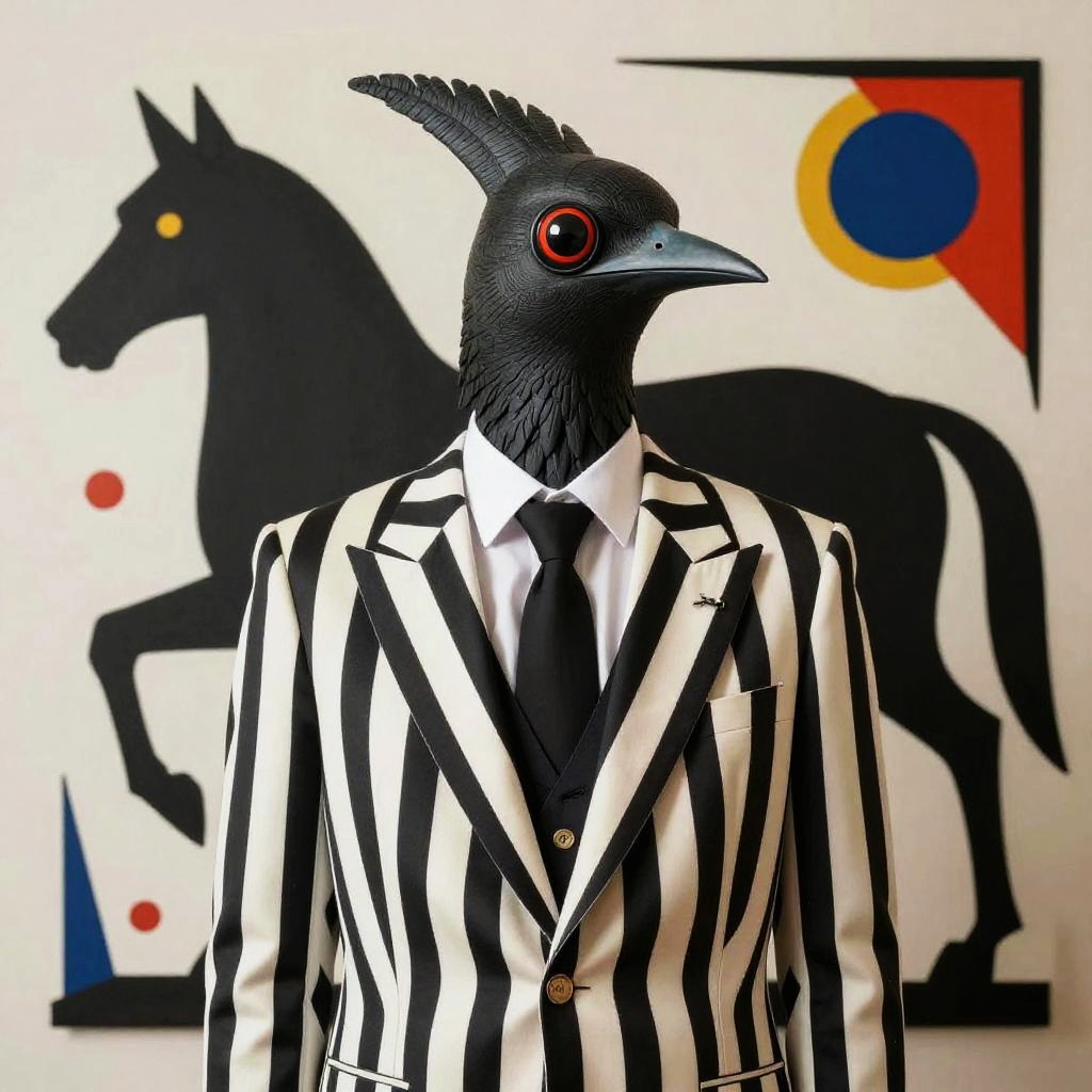 A man with a bird-like face, set against a conceptual background representing Sun in Capricorn. Dressed in a black and white striped and checkered suit, the style combines influences of Zdzisław Beksiński, Dystopian Surrealism. Rendered as a hyperrealistic photo, the composition captures a surreal, Farinetti-inspired artwork concept, with intricate, futuristic details and a thought-provoking aesthetic.