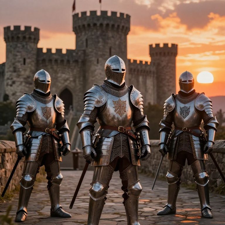 Polici officers in a medieval fantasy kingdom, armored knights with detailed emblems, ancient stone castle in the background, dramatic sunset casting orange hues, battle-ready stance, intricate armor design, fantasy realism.