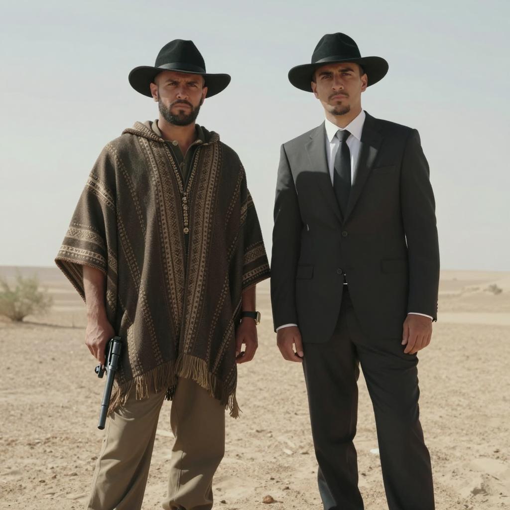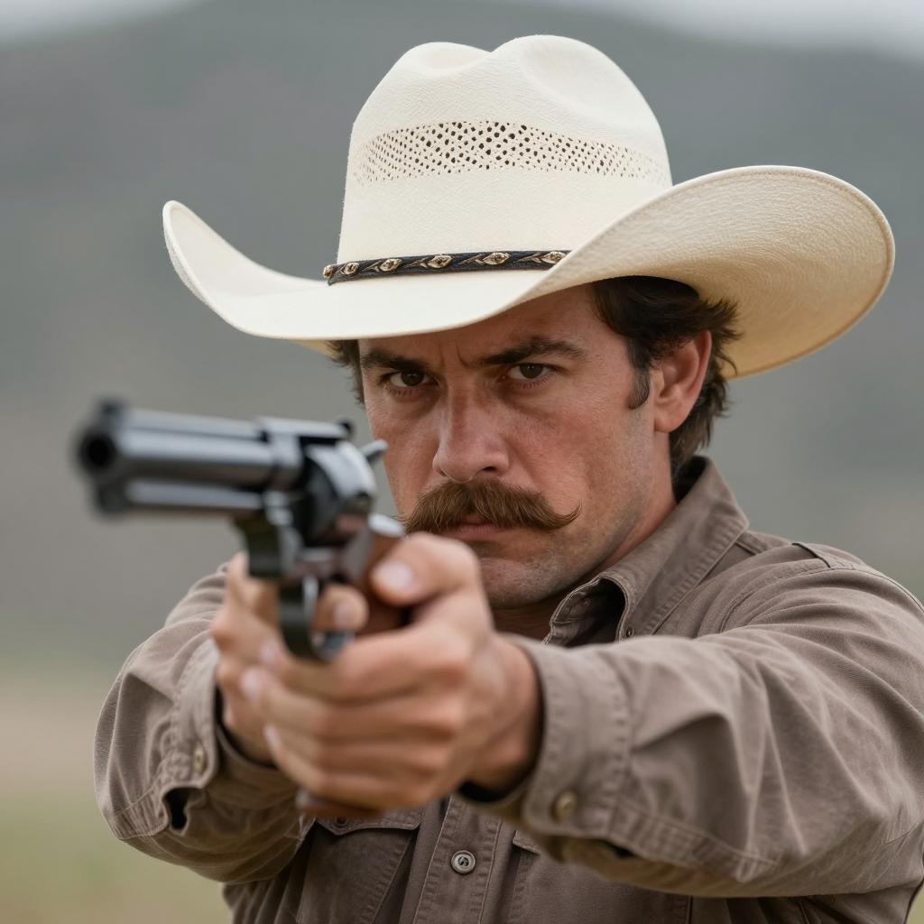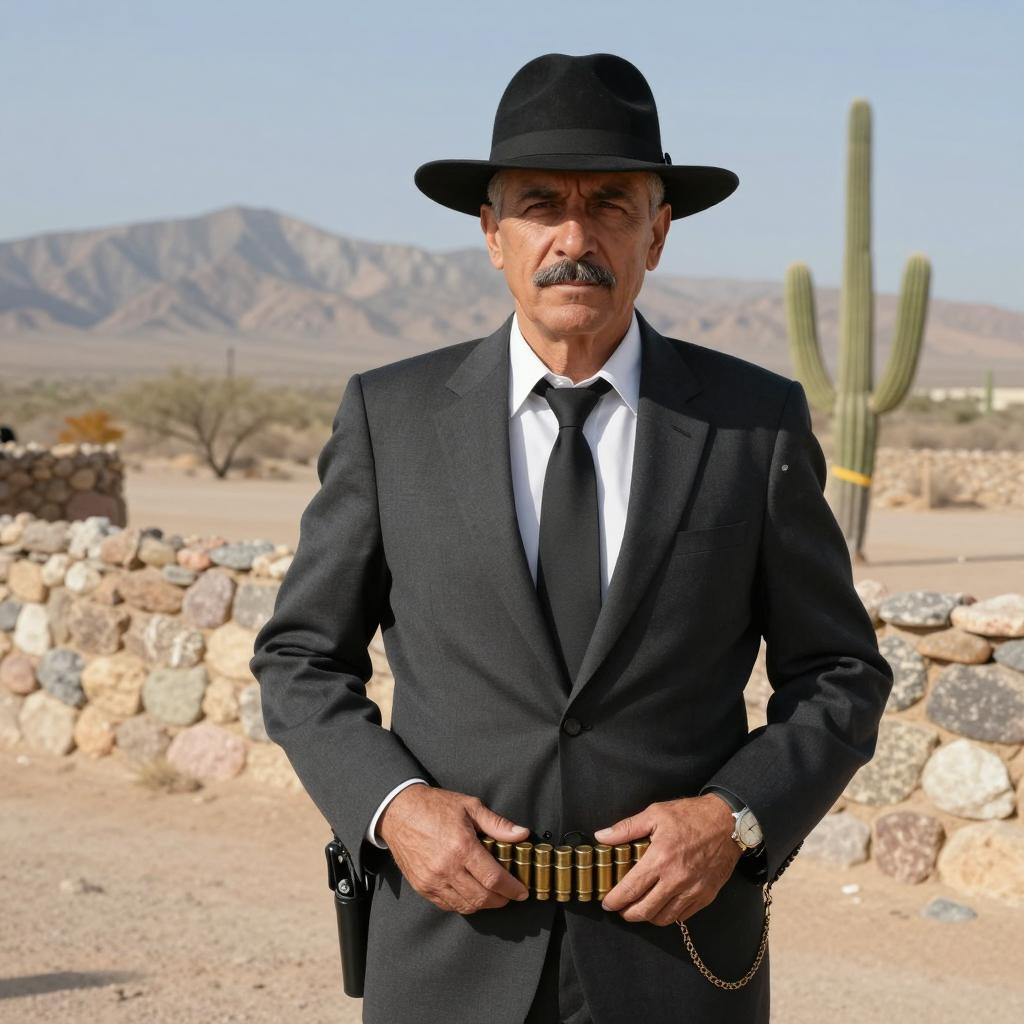 Man with medium build, light brown skin, dark mustache, and brown eyes, wearing a black hat and brown suit, holds a gun in his right hand, leaning slightly to the right. Background: dry, hilly landscape with scattered buildings and trees. Bright sunlight casts shadows. Man's expression is determined.