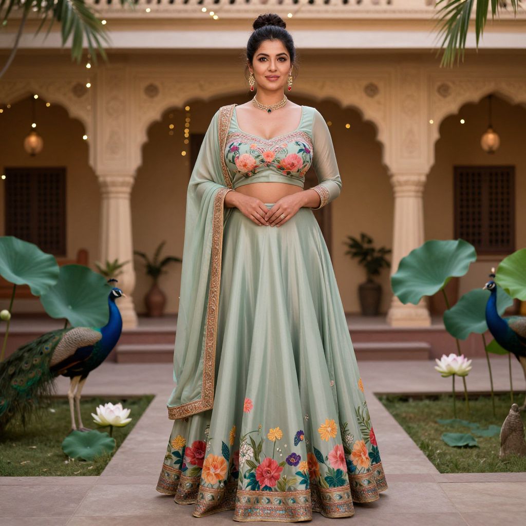 A stylish woman with fair skin, high cheekbones, and a confident smirk, wearing a modern georgette ghagra costume with floral prints, standing in a heritage-style courtyard with peacocks and lotus flowers around, in a traditional Indian wedding setup with soft string lights.. The woman has big tits and cute face