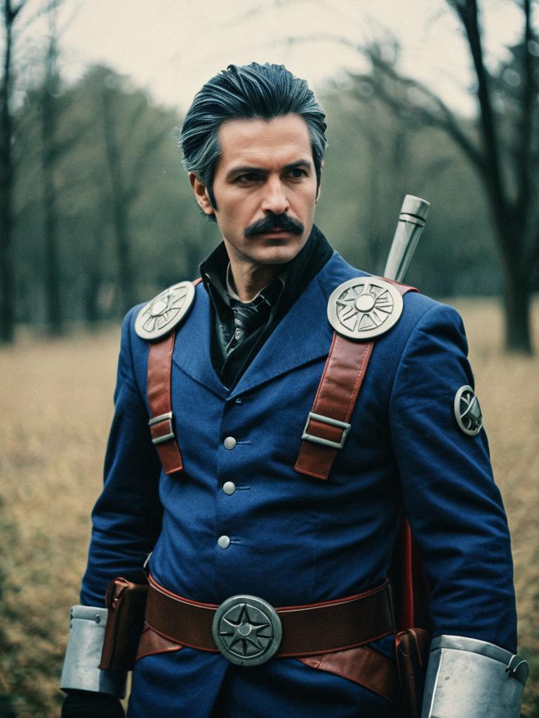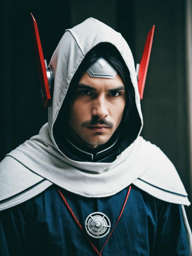 Editorial waist-up portrait of a man wearing an Anya cosplay costume with a white hooded cape, dark blue outfit, and red wing-like accessories on the sides of the hood. The man has a serious expression, dark hair, and a mustache.