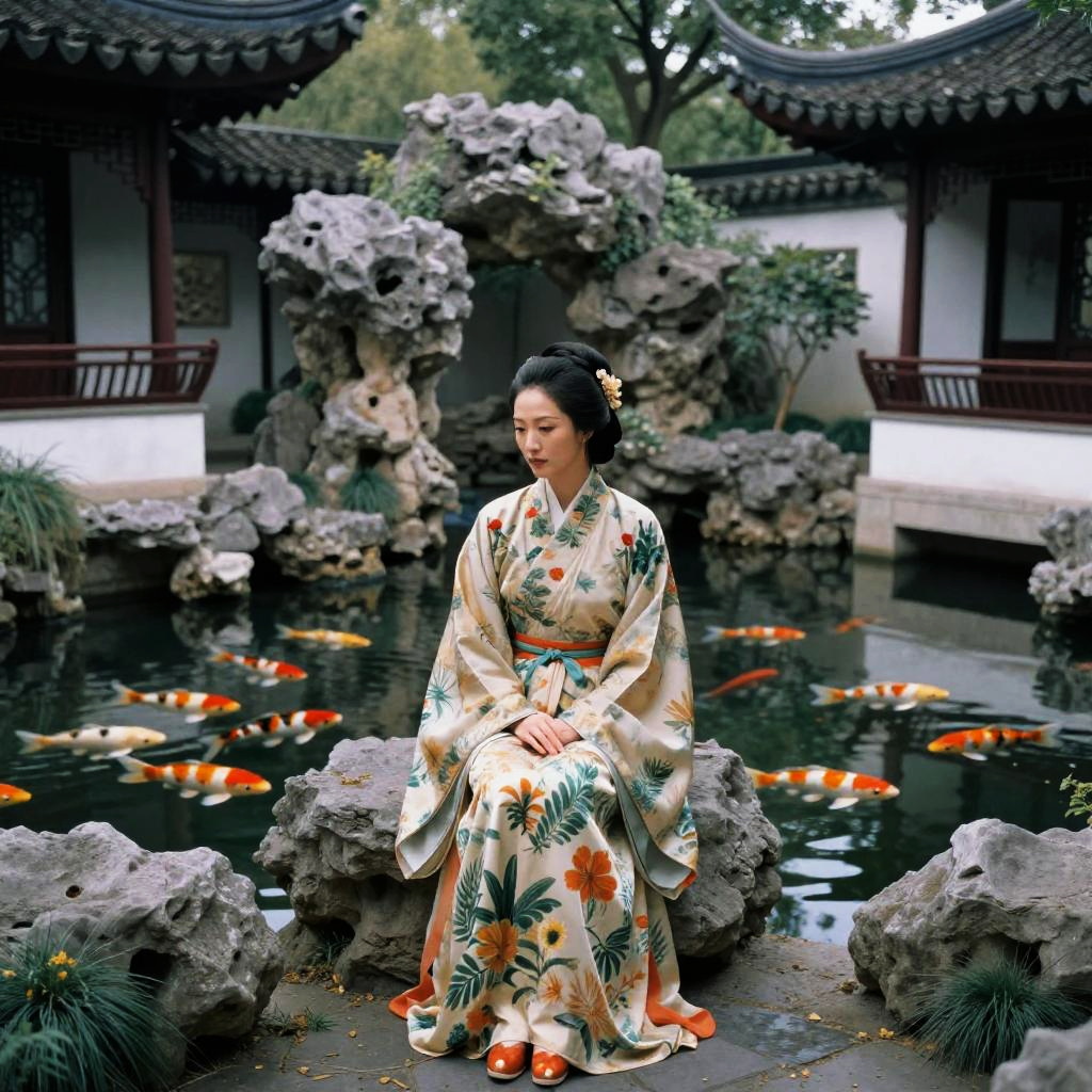 An Asian woman dressed in a botanical-themed Hanfu sits gracefully on a stone in a traditional Chinese garden. The serene setting features a koi-filled pond surrounded by intricate rockeries and classical architecture. The vibrant floral patterns on her Hanfu harmonize with the natural elements of the garden, creating an elegant and peaceful scene.