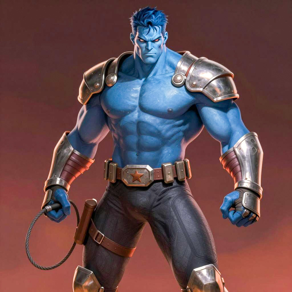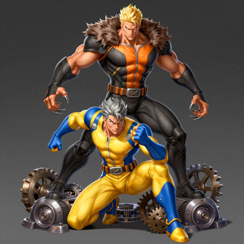 Digital illustration of a muscular, male superhero with wild gray hair and a beard, snarling with intense anger. He wears a yellow and blue costume with black shoulder pads and blue boots. His right hand is gripping sharp claws, poised to attack. He's standing on a rocky base with one leg raised. His left hand is clenched. The background is a solid pink color. He has defined muscles and a fierce expression. The overall style is dynamic and action-oriented.