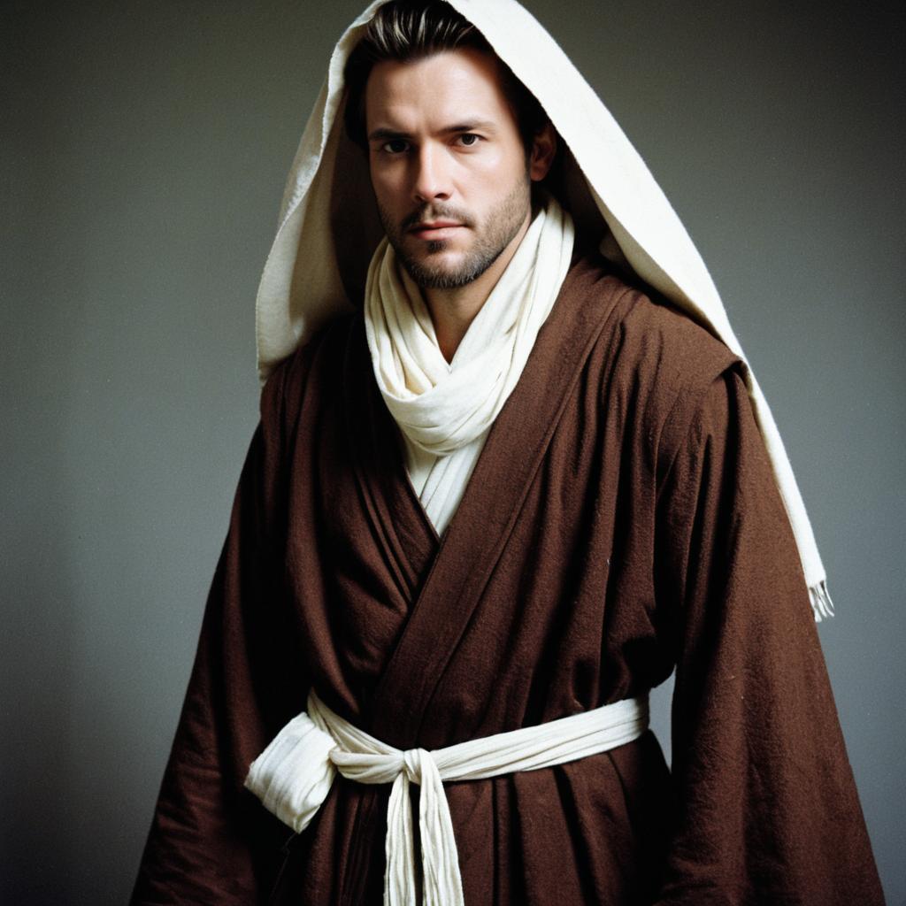 Quality Jedi Costume, man in a brown robe and a white scarf