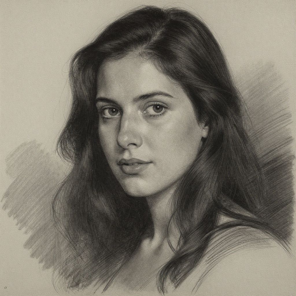 Charcoal portrait meticulously rendered by Louis Smith, featuring a woman with cascading dark hair, expressive eyes, and a soft, contemplative gaze against a subtly textured background.