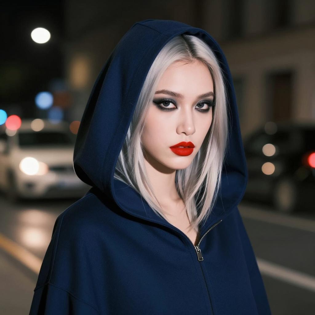 A woman with red hair, dark green eye makeup, red eyeliner, and red lipstick. Red scars on her forehead. Dark background. Red light illuminates her hair and face. She has a neutral expression.