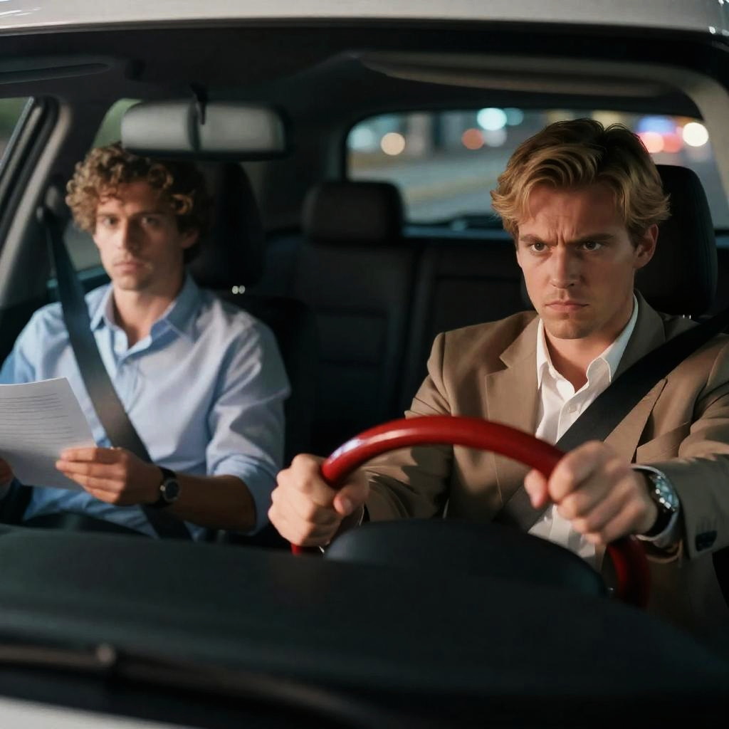 Photograph of two men in a car at night. Driver with blond hair, light brown suit, gripping red steering wheel, intense expression. Passenger with curly hair, light blue shirt, wristwatch, holding paper, neutral expression. Blurred city lights in background.