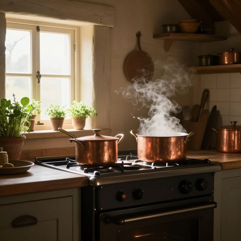 Cuisiniere in a rustic French kitchen, warm natural light streaming through windows, surrounded by copper pots and fresh herbs, vintage stove with steaming pots, cozy and inviting atmosphere, detailed textures and soft shadows