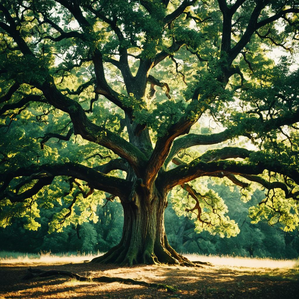 A ancient oak tree, majestic branches with emerald green leaves and knotted bark, peaceful forest clearing bathed in golden afternoon light, majestic and rhythmic.