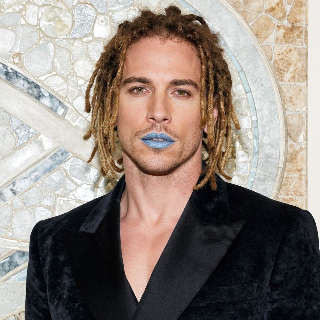 A close-up portrait of a man with dreadlocks, pale blue lips, and a black velvet suit, rendered in a realistic, octane style with rim lighting and watercolor effects, set against a mosaic background.