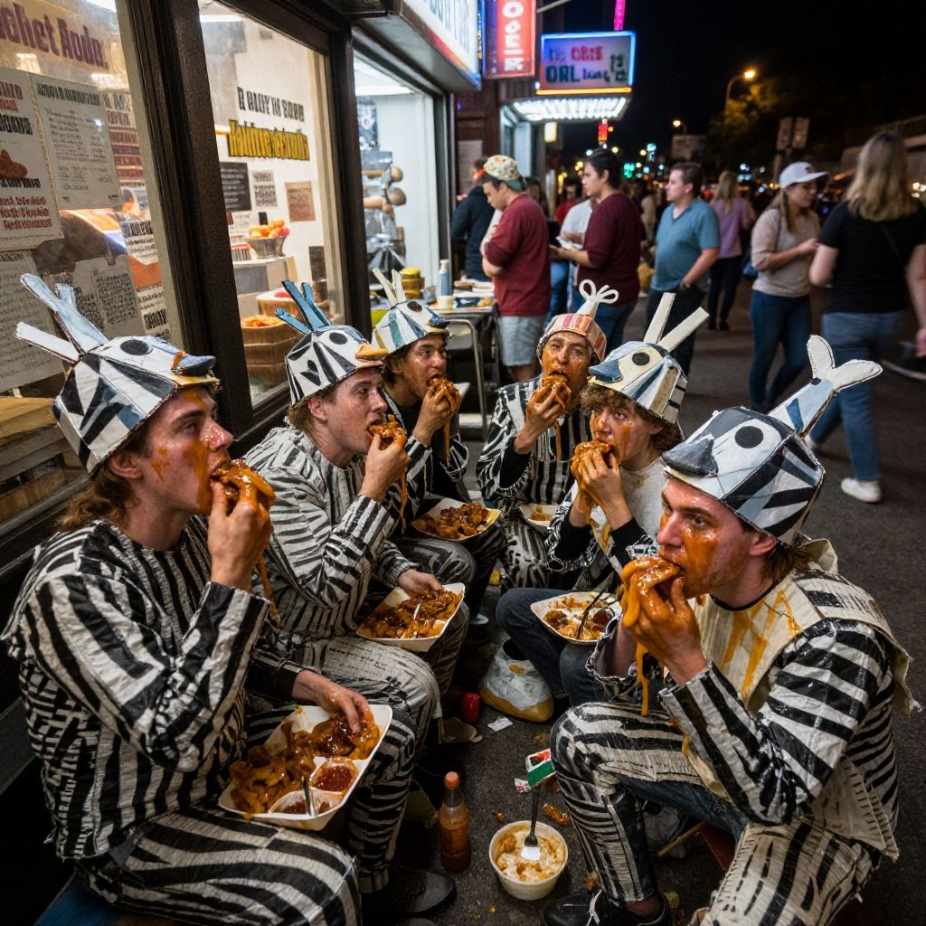 An award winning genre defining documentary photograph, hi lighting the plight of mentally ill people, A group of societies rejects congregating, cramming disgusting food into their mouths, in a gluttonous frenzy, their greasy faces covered in sauces from the food. wearing cheap poorly made zebra costumes, hand made, paper mache, fish head helmets, while sitting outside of a sleazy adult bookstore, crowded with pedestrians in the background, cinematic still, night street photography style, long exposure, neon light