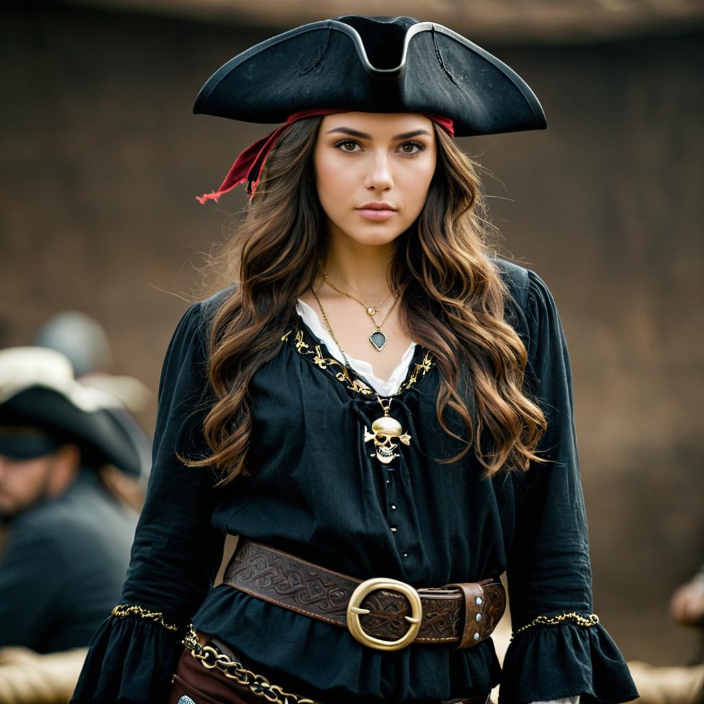 Woman black pirate costume,1girl, solo, long hair, hat, pirate, brown hair, pirate hat, belt, necklace, looking at viewer, jewelry, blurry background, long sleeves, standing, blurry, pants, wavy hair, cowboy shot