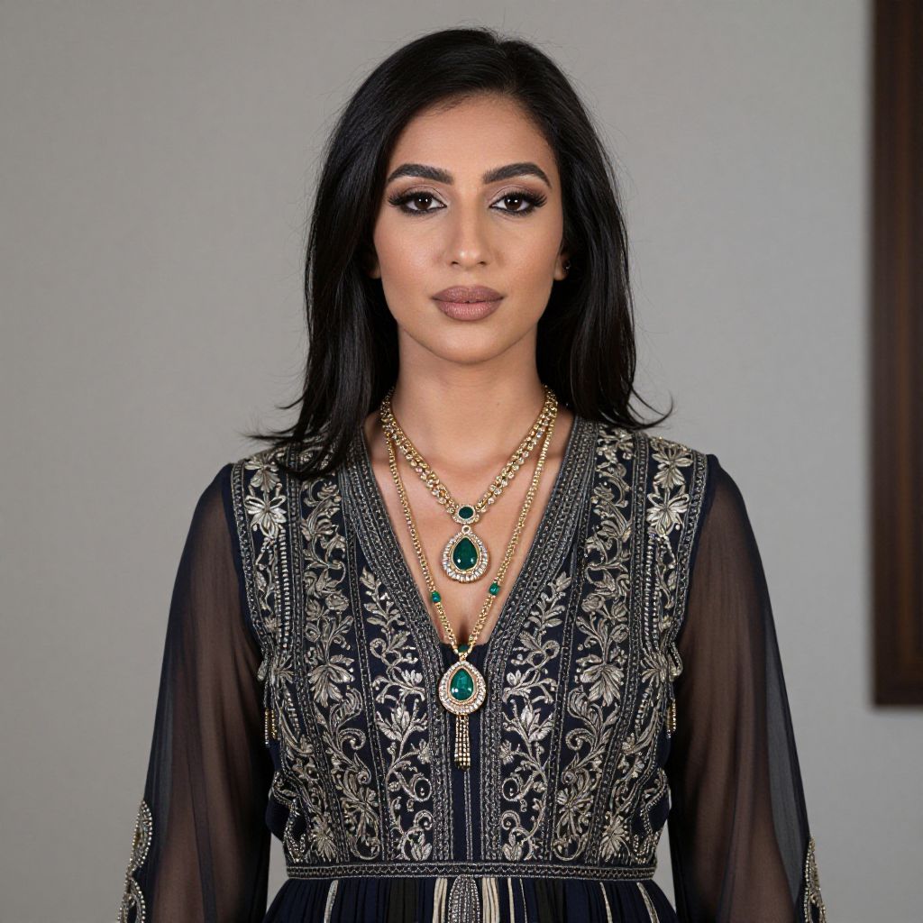 Middle eastern woman, solo, 1girl, jewelry, necklace, looking at viewer, dress, black hair, realistic, standing
