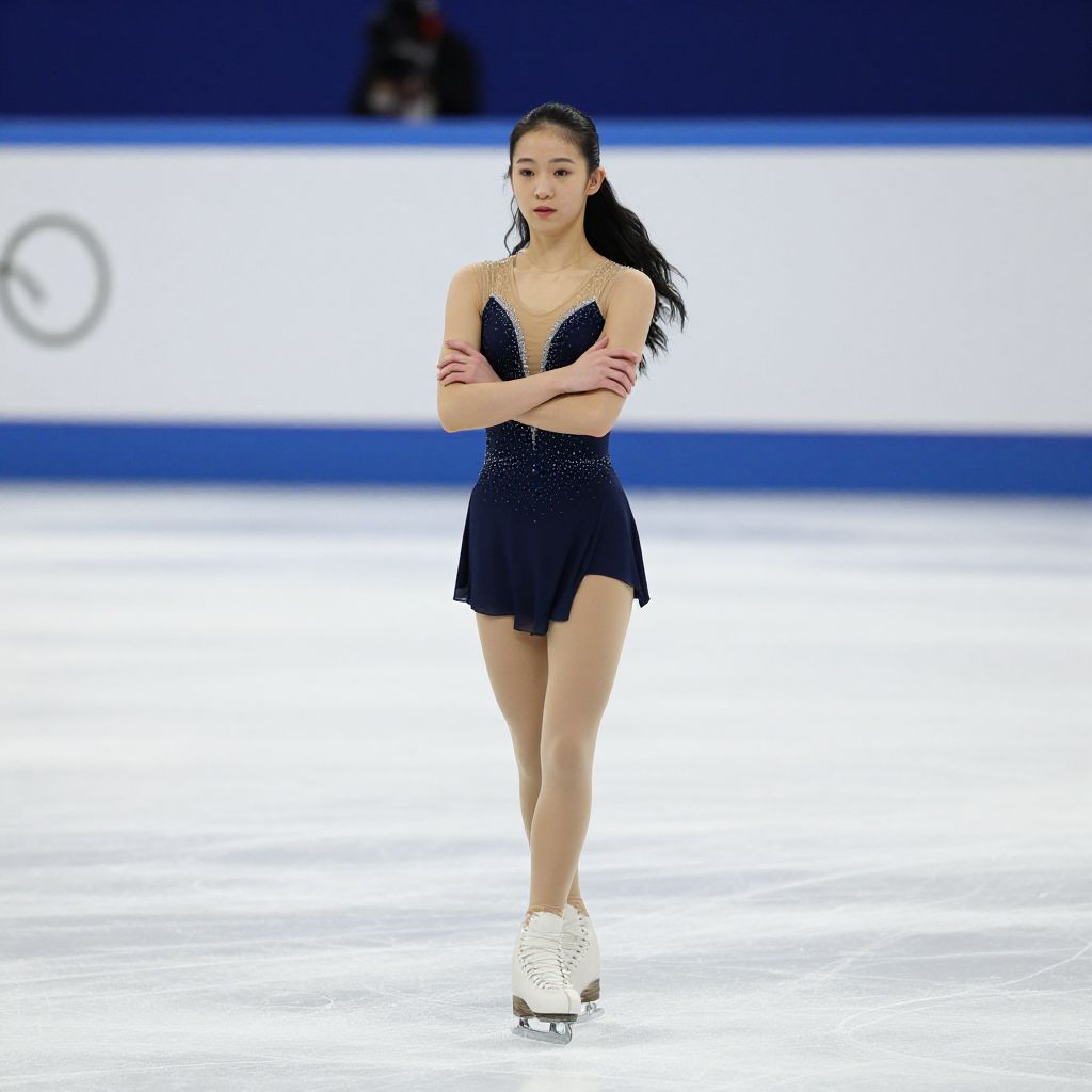 Photograph of a young Asian female figure skater with long black hair, wearing a navy blue, sparkly, V-neck dress and white skates