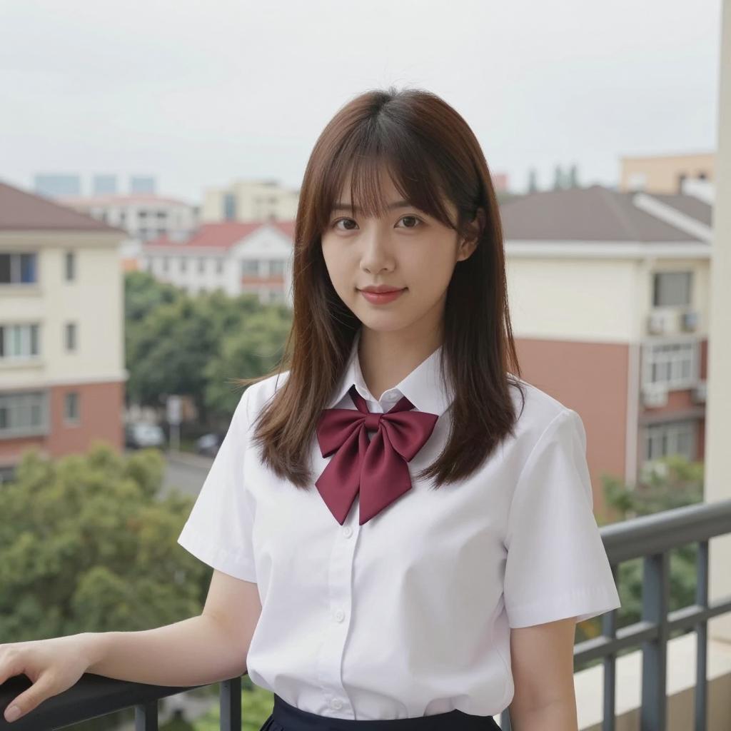 RAW photo, best quality, masterpiece:1.2), (realistic, photo-realistic:1.37), ultra-detailed, 1 girl, cute, solo, beautiful detailed sky, detailed cafe, night, sitting, dating, (nose blush), (smile:1.1), (closed mouth)medium breasts, beautiful detailed eyes, (collared shirt:1.1), bowtie, pleated skirt, (short hair:1.2), floating hair