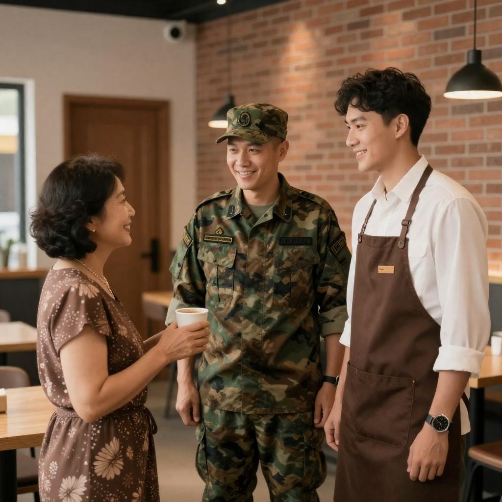 Group of six people at a table, Christmas setting. Central man in dark military-style coat, blue fur hat, being fed by woman in black beanie and glasses. Woman in pink hat feeding him from left. Man in grey sweater on right, smiling. Decorative table with candles, grapes, and food. Warm, lit lamp in background. Traditional painting on wall.