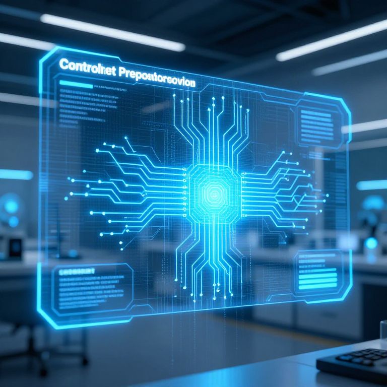 ControlNet preprocessor resolution technology displayed as a futuristic holographic interface with intricate neural network patterns, glowing blue circuits, and digital data streams in a sleek modern lab environment, high detail, cyberpunk aesthetic.