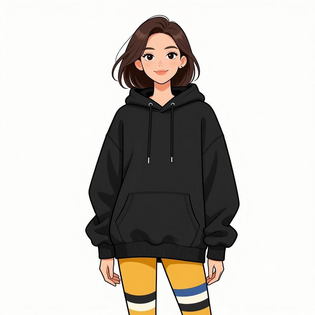 Woman with pretty face and pretty hair. smiling Woman, casual streetwear, oversized black hoodie, long sleeves, front kangaroo pocket, ribbed cuffs, striped leggings in mustard yellow, black, white, and various shades of blue, fitted silhouette, plain white background. --sref 1467