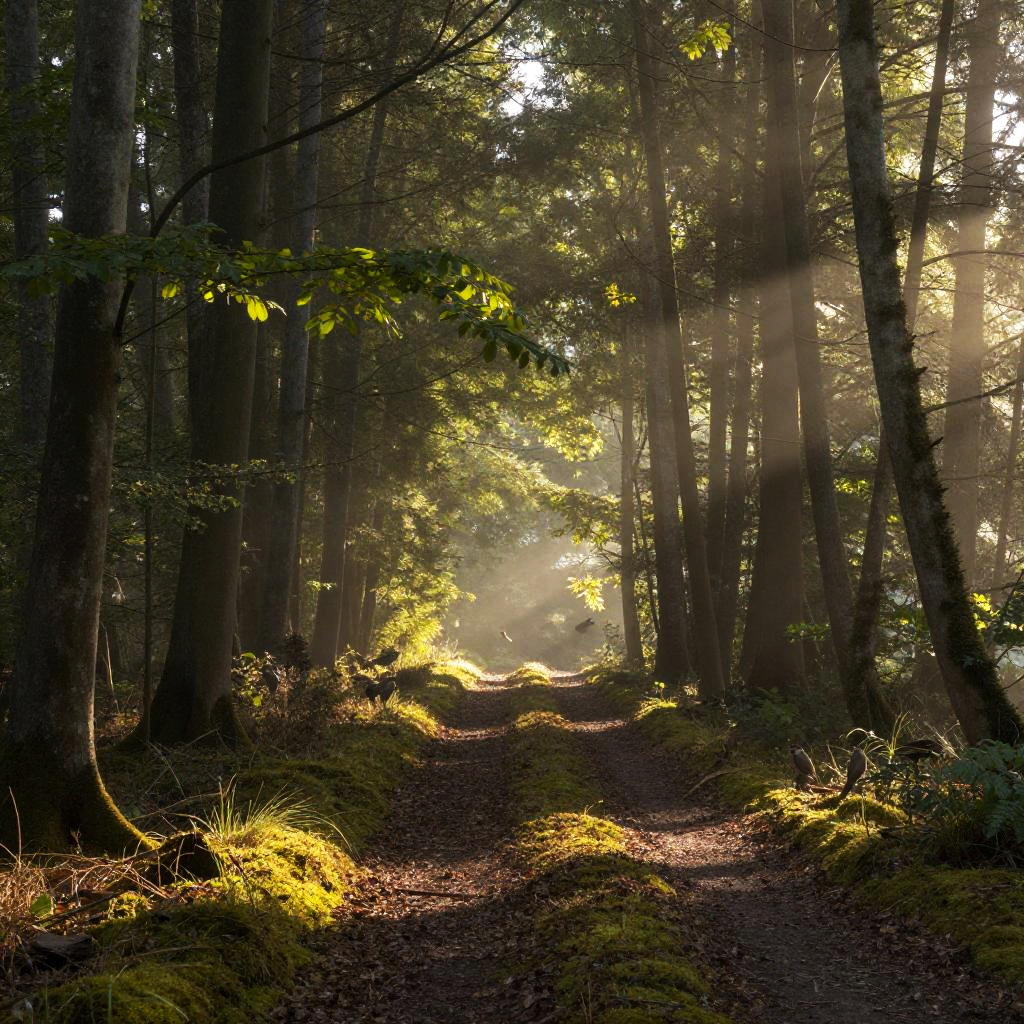 Tranquila forest path early morning, dappled sunlight breaking through tall trees, soft moss covering the ground, tranquil birdsong in the air, a gentle breeze rustling leaves, inspiring peace and connection with nature’s calm.