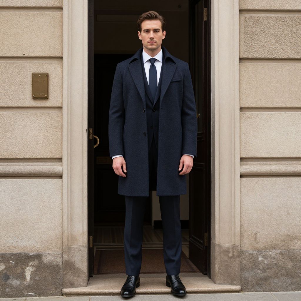 Formal Winter Wear Male Costume, man in a suit and coat standing in a doorway