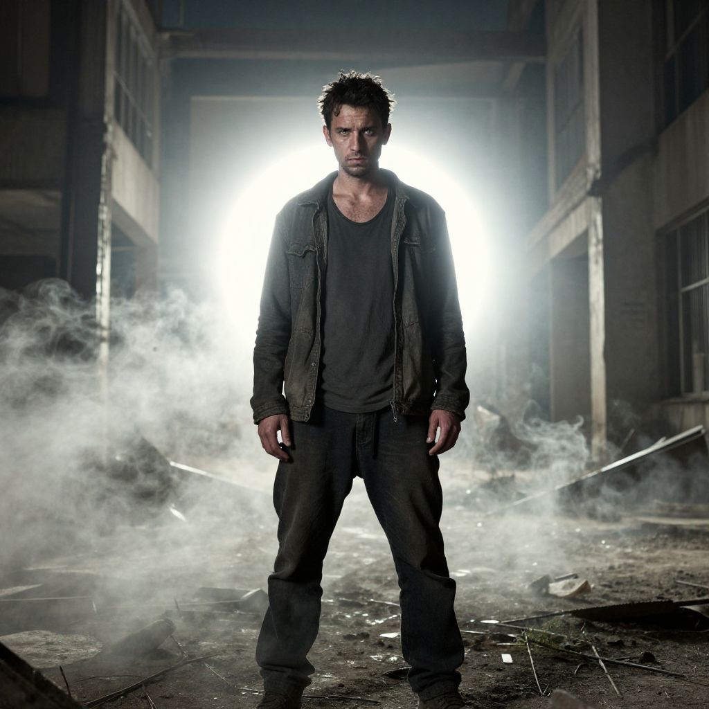Photograph of a rugged, muscular man with short, spiky black hair and a serious expression. He wears a dark, worn-out jacket over a black t-shirt and black pants. He stands in a dilapidated, smoky, industrial building with broken glass and debris on the floor. Bright white light shines from behind him, creating a dramatic backlight effect and illuminating the smoke. The background features tall, broken windows and crumbling walls, adding to the gritty, post-apocalyptic atmosphere. The man's intense gaze and strong stance dominate the image, emphasizing a sense of determination and toughness.