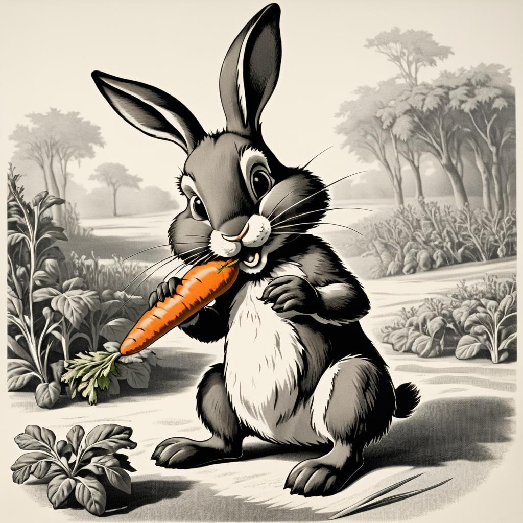 Vintage-style lithograph illustration of an anthropomorphic rabbit sitting and eating a bright orange carrot. The rabbit is depicted with expressive eyes, large ears, and detailed fur textures, set against a muted background of a garden with leafy plants and trees.
