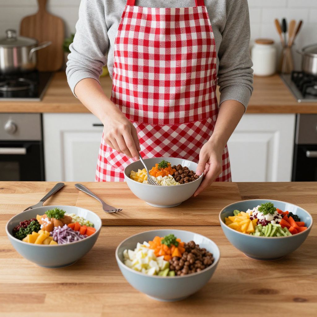 Woman preparing a dish in a cozy kitchen, wearing a red-and-white checkered apron, with three bowls containing colorful food arrangements and utensils neatly placed on a wooden table.
