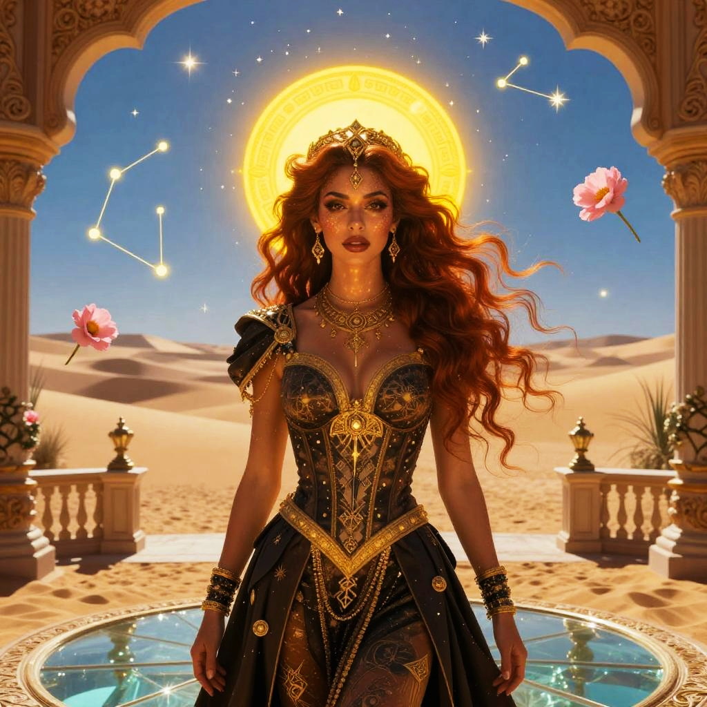 Surreal, vibrant portrait of mera, a captivating figure with flowing umber tresses and warm amber-toned glowing skin, set within a grand ballroom made of golden sands and glass in the heart of a sunlit desert oasis. They wear an ornate dark uniform with gold accents and arcane sigils; a radiant yellow halo crowns their head as stars scatter across a cobalt sky. Pink flowers drift among constellations, luminous hues, dreamy atmosphere, rococo surrealism blending warm light with intricate, delicate carvings.