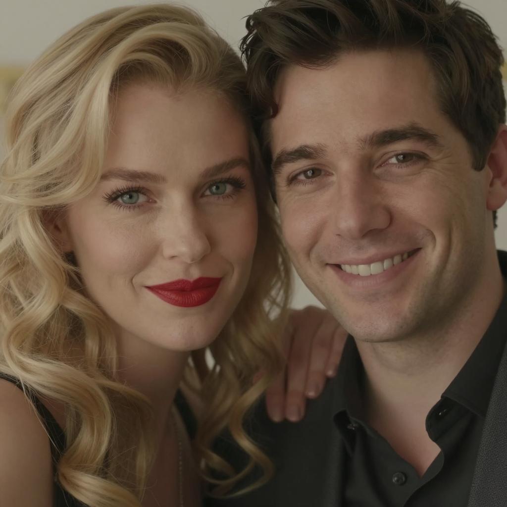 A man and woman standing close together. The woman, with short brown hair, red lipstick, and a red dress, looks to the right. The man, with dark hair, blue eyes, and a black shirt, looks slightly to the left. Both have neutral expressions. Background is dark and blurry. The man is on the right, the woman on the left.