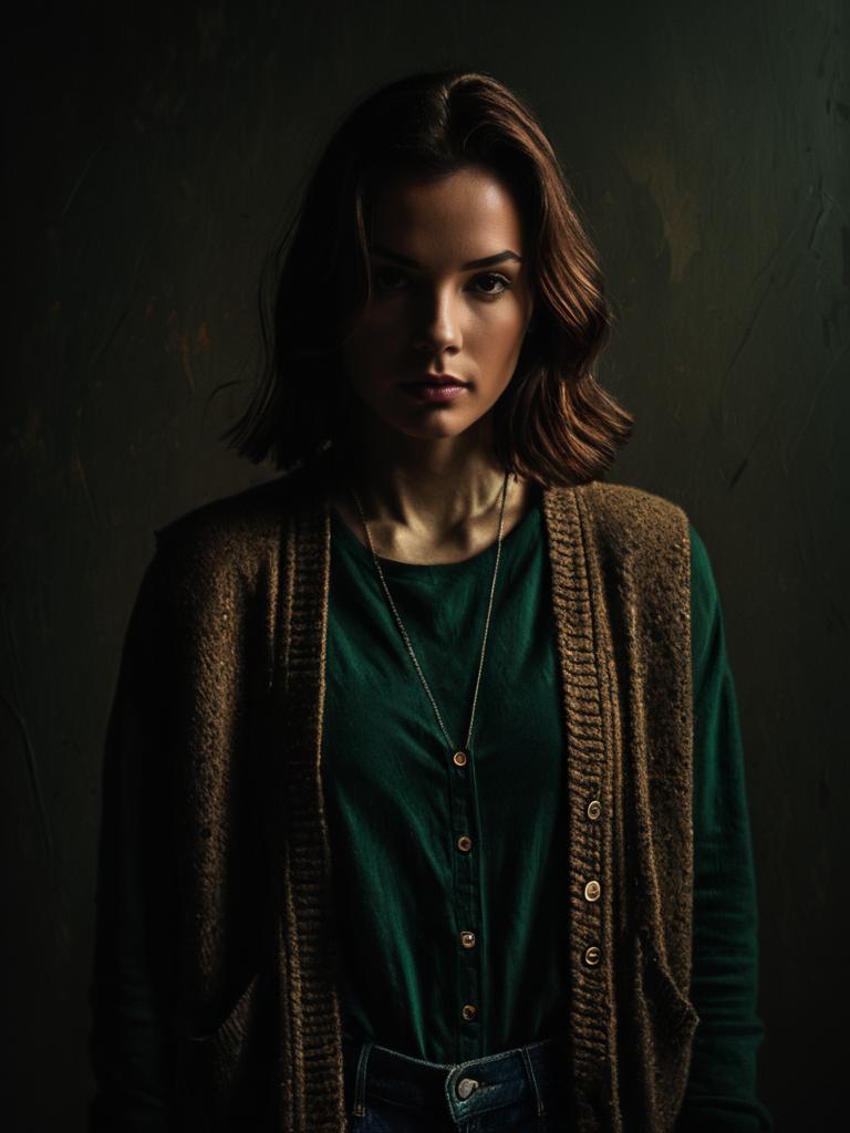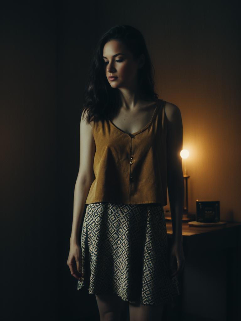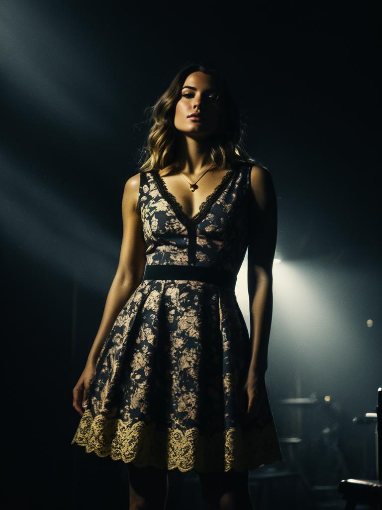 A young woman wearing a sleeveless pink skater dress with a lace-like floral pattern and V-neckline. The dress features a fitted waist and a flare skirt that falls above the knee. She accessorizes with a simple pendant necklace. The background is dark with warm lighting from a hanging lamp, creating a moody and intimate atmosphere.