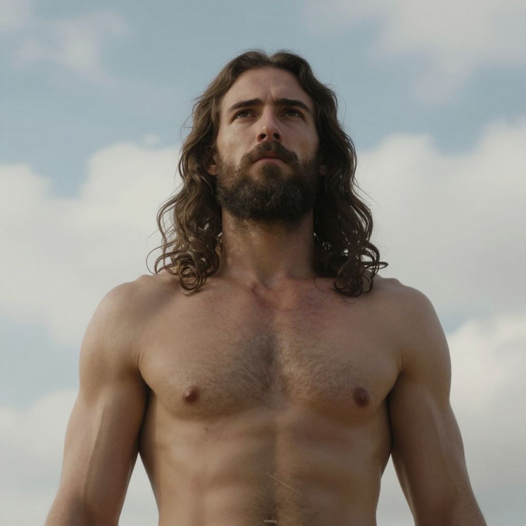 A muscular man with long hair and a beard is depicted in a serene, ethereal sky with clouds, resembling a religious figure.