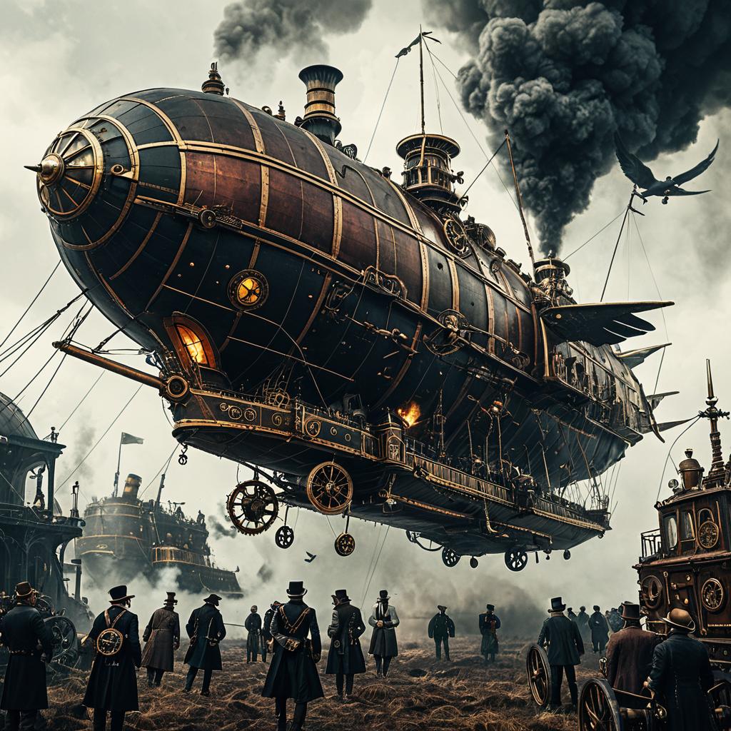 Playful steampunk airship battle, realistic and cinematic digital illustration, smoky environment, intricate machinery, meticulous attention to texture, anatomy, and environment.