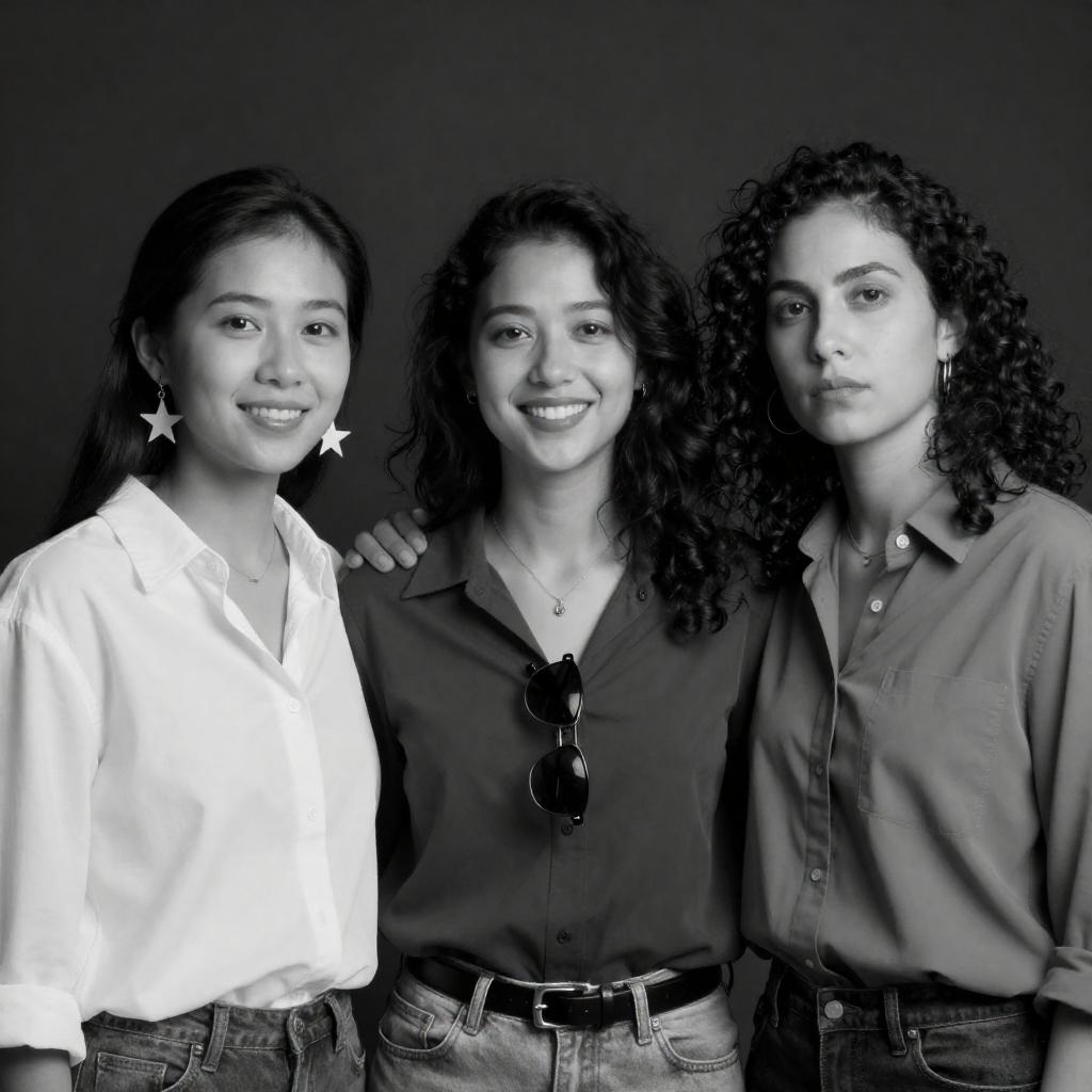Photograph of six women standing in a line against a plain white wall. They wear varied outfits including floral blouses, polka-dot skirts, black tank tops, and denim. Five women have straight hair, one has black, short, tousled hair. Smiles on all faces. Casual, stylish attire. Standing in a relaxed, parallel formation. Bright, even lighting.
