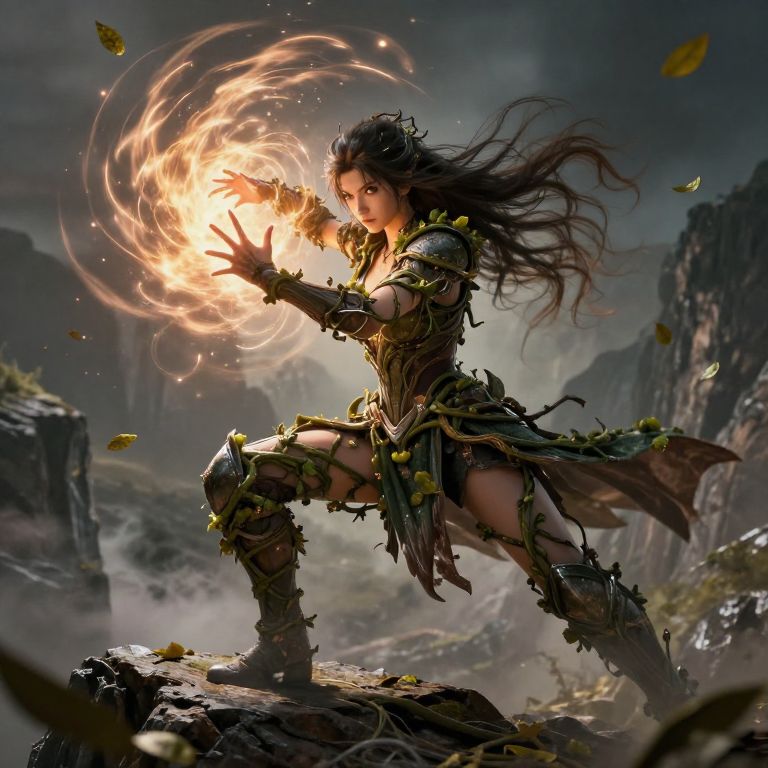 A digital fantasy artwork depicts a fierce, dark-haired female warrior with long, flowing hair, wearing tattered, leafy armor. She is crouching on a rocky, misty terrain, surrounded by jagged cliffs and floating leaves. Her right hand is glowing with a swirling, fiery orb of light, casting an intense, golden hue. Her expression is focused and determined. The background is dark and moody, with a cloudy sky and misty atmosphere, enhancing the mystical and powerful vibe. The image combines elements of fantasy and magic, highlighting her strength and control over fire magic.