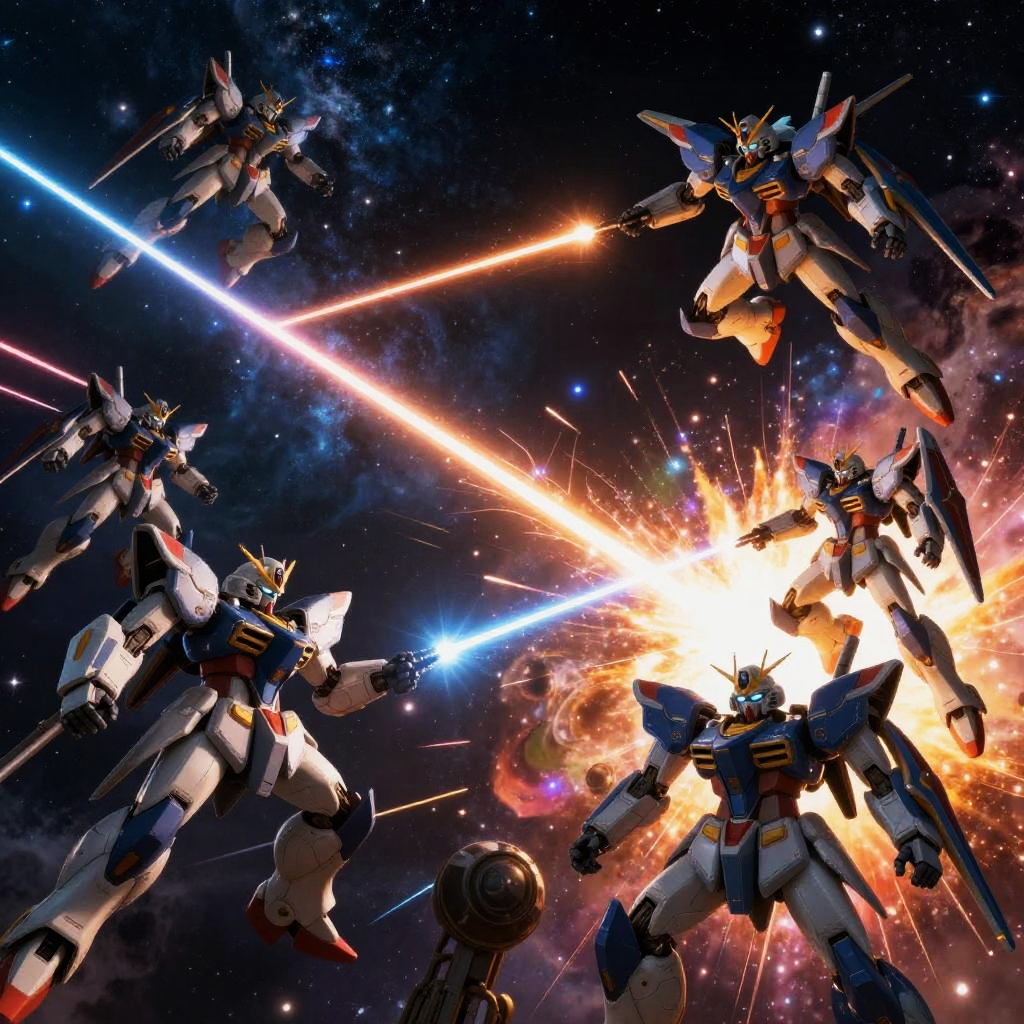 Epic Macross-inspired space battle scene, massive mecha fighters clashing amidst stars and colorful nebulae, intense laser beams and explosions, high-detail sci-fi elements, dark cosmic backdrop, dynamic composition capturing motion and scale