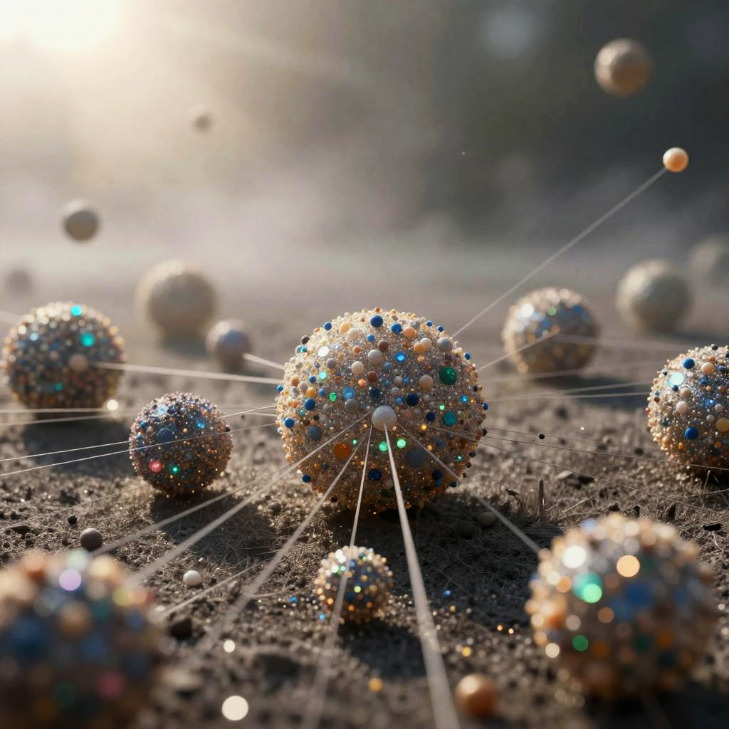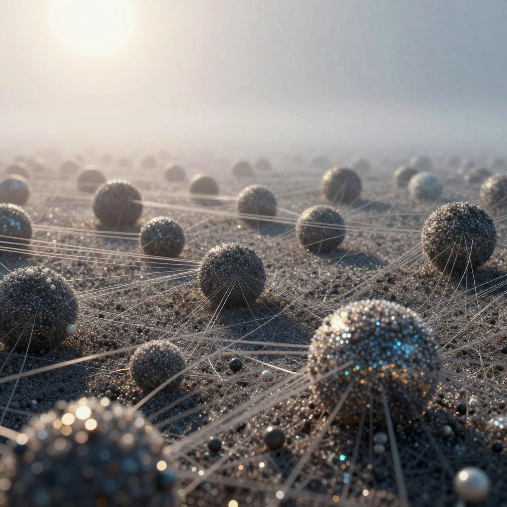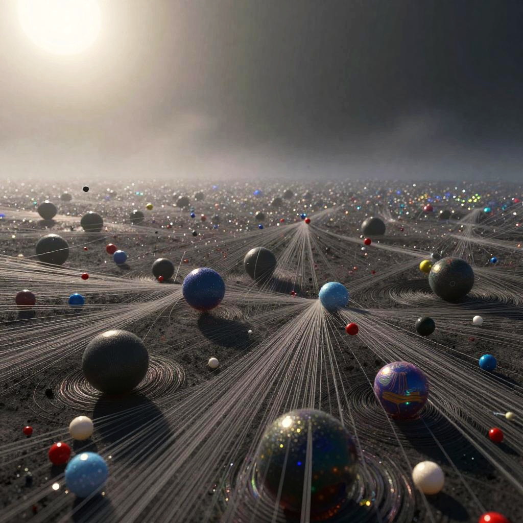 A foggy, surreal forest scene with bare trees connected by numerous delicate strings adorned with dark orbs, resembling a visual representation of a quantum realm. The ground is sprinkled with glowing, multicolored particles creating a shimmering effect under diffused light. The image evokes a blend of natural and abstract elements with a mysterious atmosphere.
