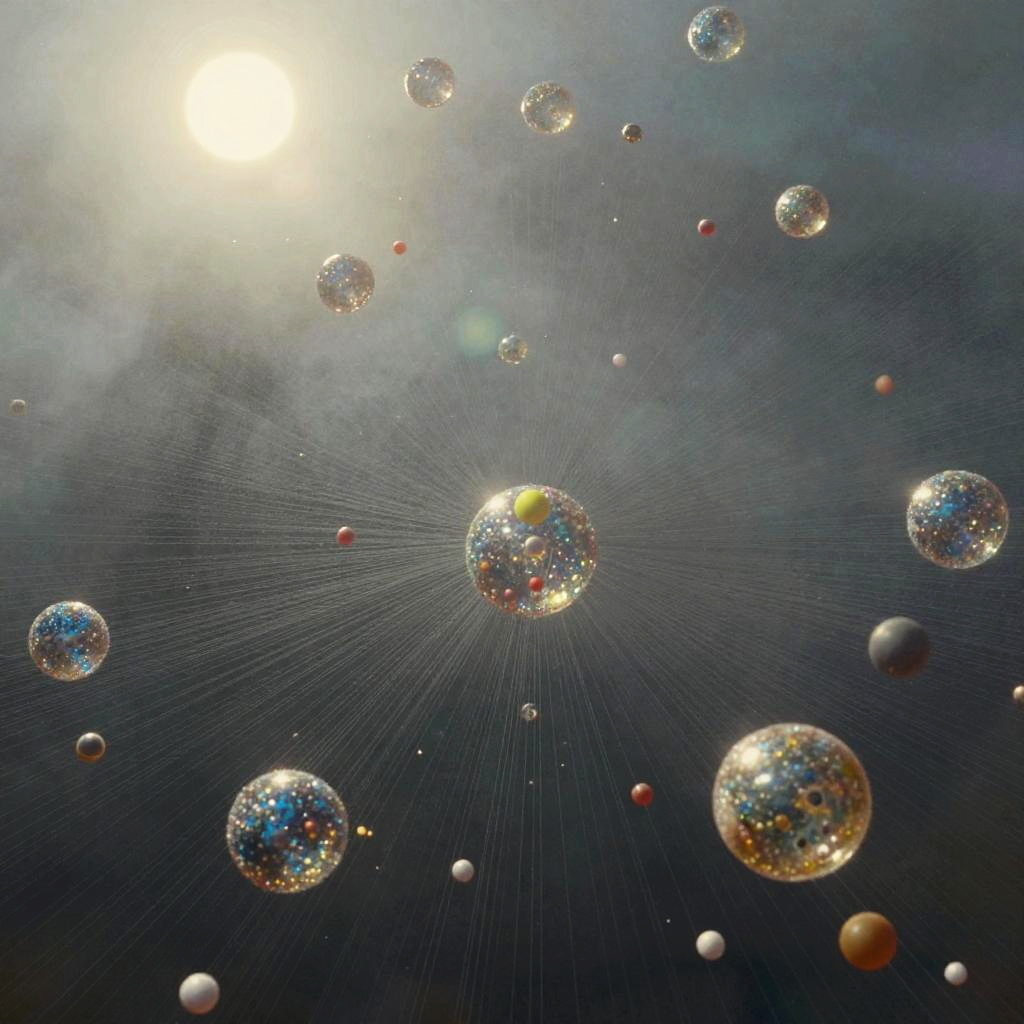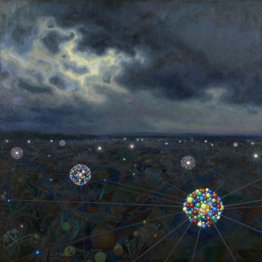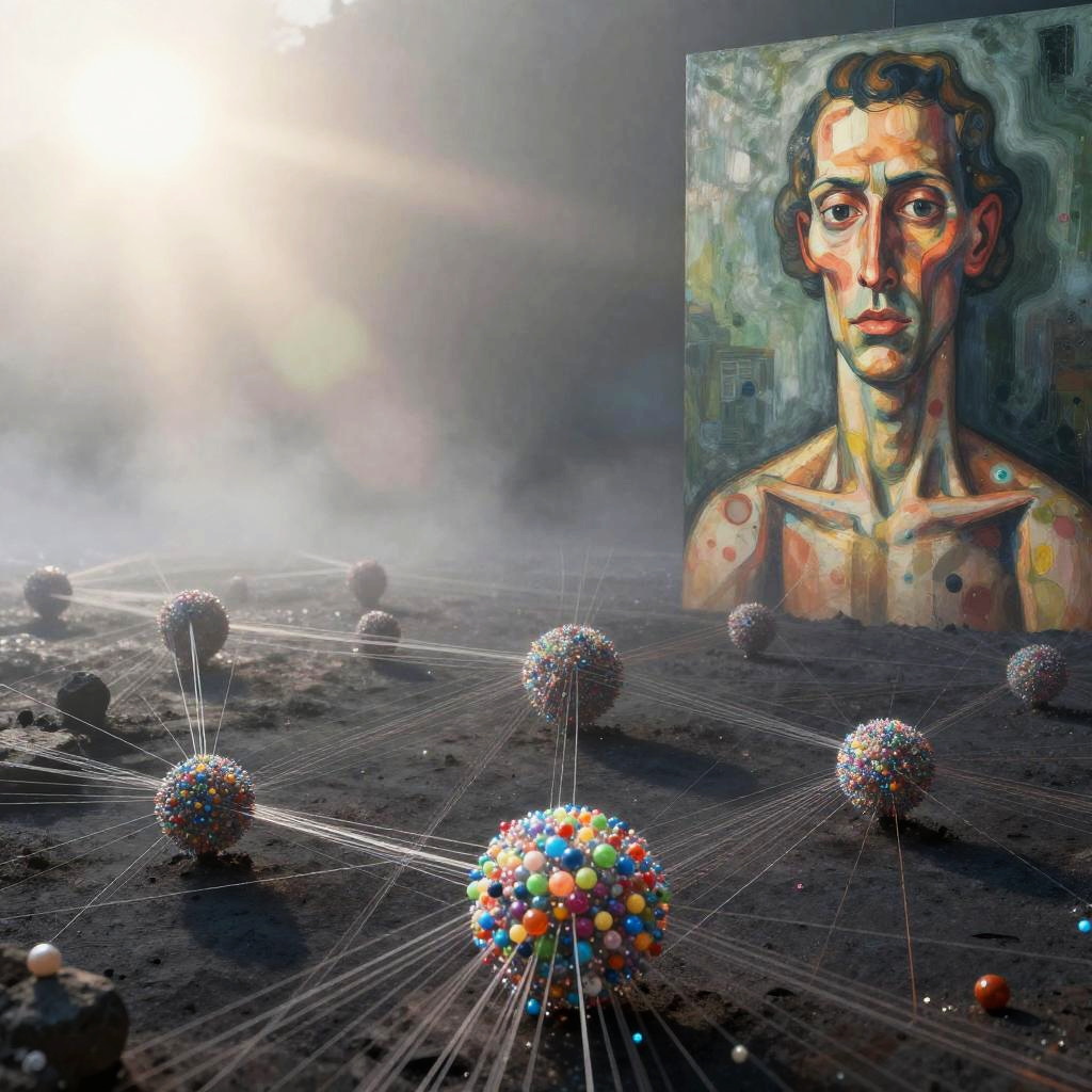 A foggy, surreal forest scene with bare trees connected by numerous delicate strings adorned with dark orbs, resembling a visual representation of a quantum realm. The ground is sprinkled with glowing, multicolored particles creating a shimmering effect under diffused light. The image evokes a blend of natural and abstract elements with a mysterious atmosphere.