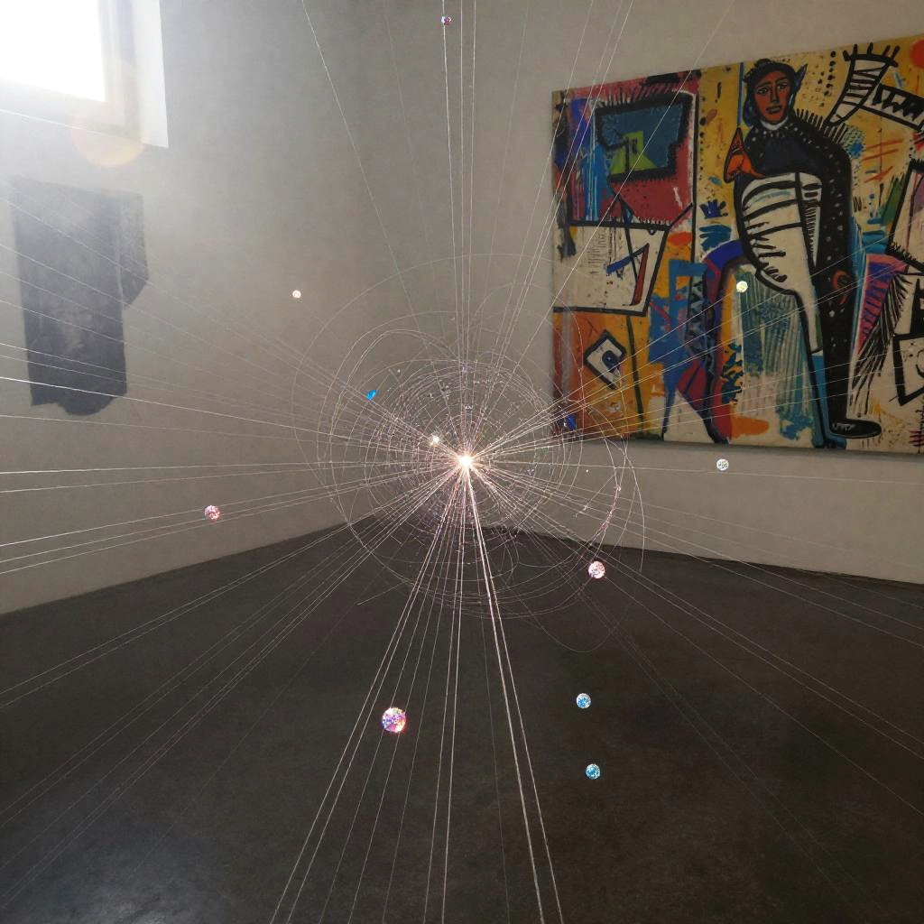 A visual representation of a quantum realm, shimmering particles, interconnected strings, 8k panoramic view, foggy and sunny, shifting light states, inspired by Miro, Cézanne, Bacon