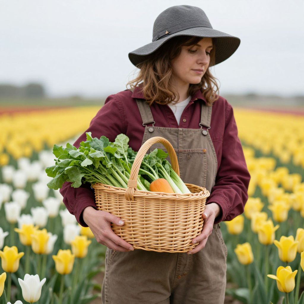 Woman holding a wicker basket brimming with fresh green leafy vegetables, wearing a maroon jacket, brown overalls, and a wide-brimmed gray hat, standing amidst a vibrant field of blooming yellow and white tulips under a soft, sunny spring sky.