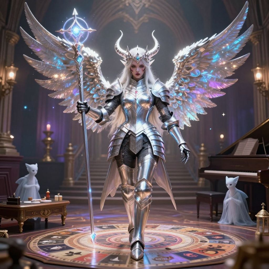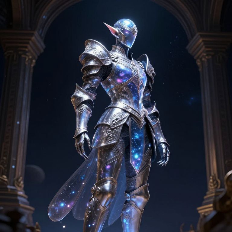 Astral elf armor crafted from enchanted metals, glowing softly with cosmic energy, elaborate filigree and translucent sections revealing starlight within, standing tall in an ancient temple floating in space, surreal and magical atmosphere