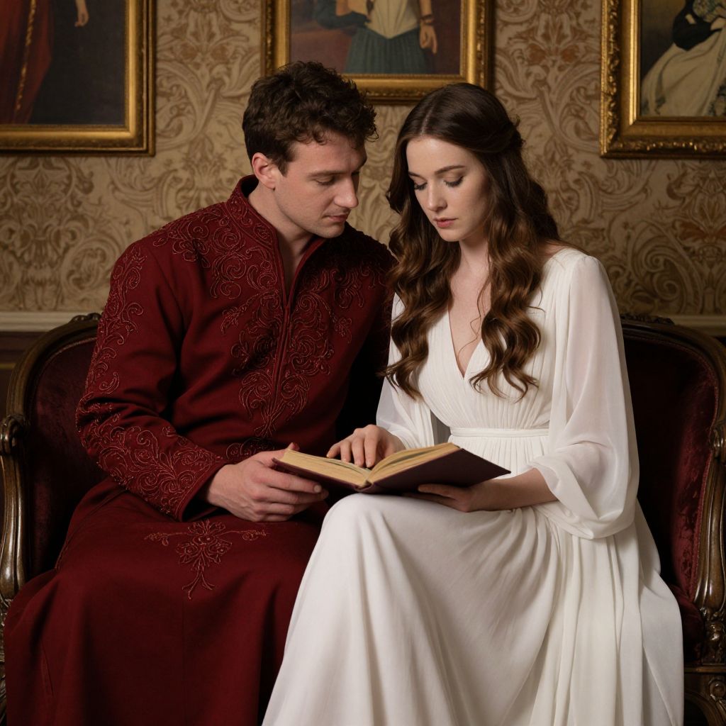 Man and woman seated in an intimate setting, the man in a richly embroidered red robe leaning close as the woman, dressed in a flowing white gown, holds an open book, her hand gently guided by his, set against a backdrop of ornate wallpaper and framed artwork.